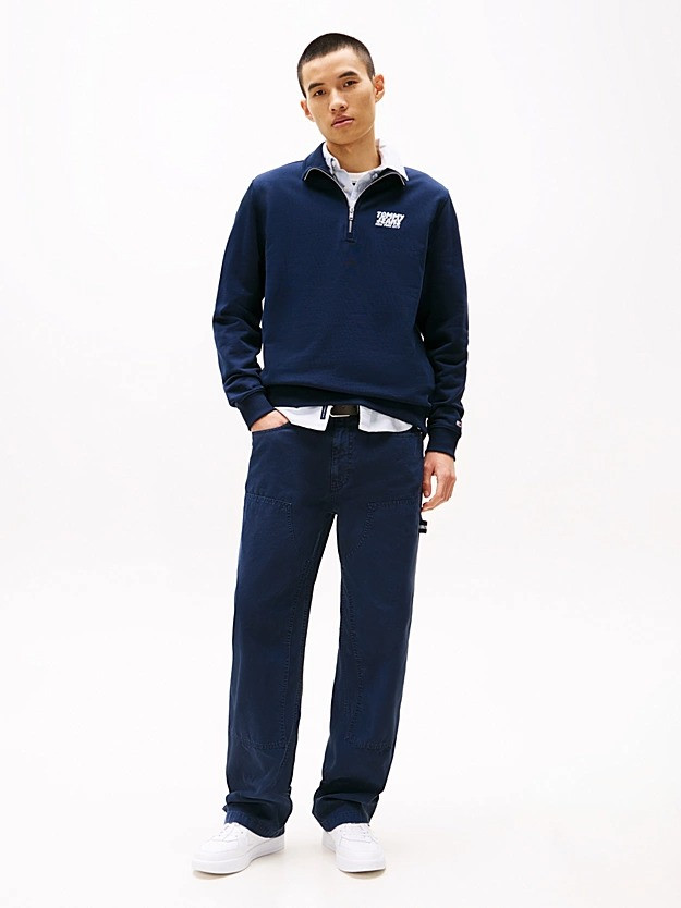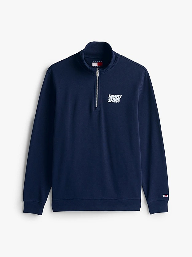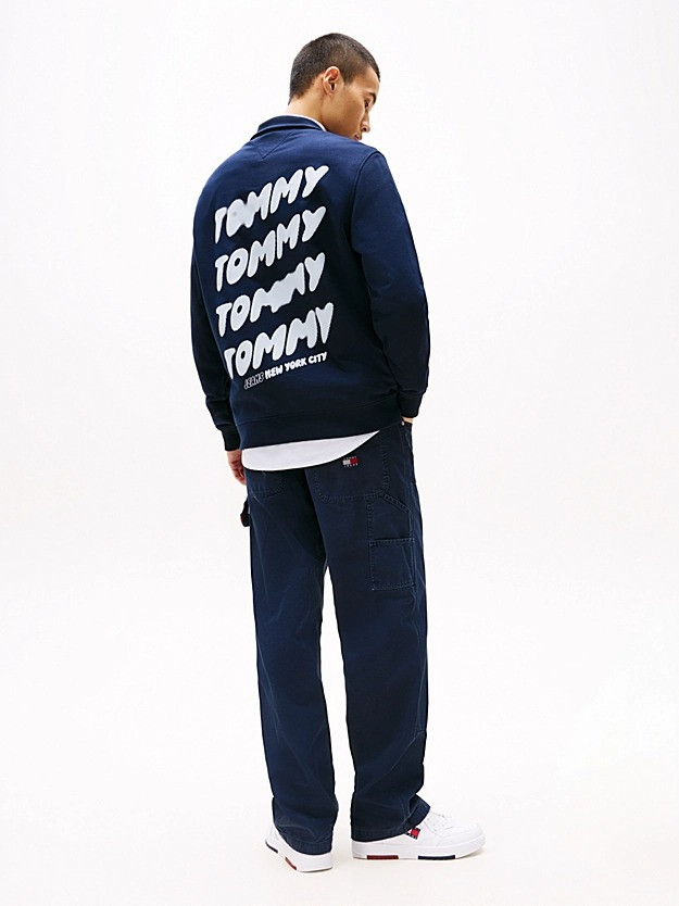 Product Description: This Tommy Jeans sweatshirt is made from pure cotton and features a bold bubble logo graphic on both the chest and the back, radiating retro street-art vibes. Designed with a quarter-zip collar, rib-knit cuffs and hem, and finished with a Tommy Jeans flag patch on the sleeve.
