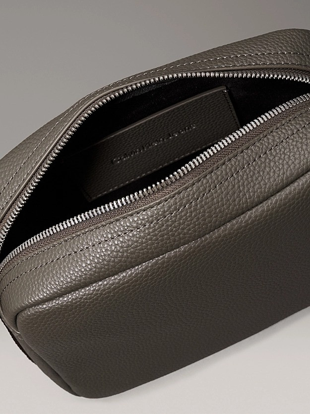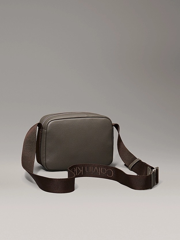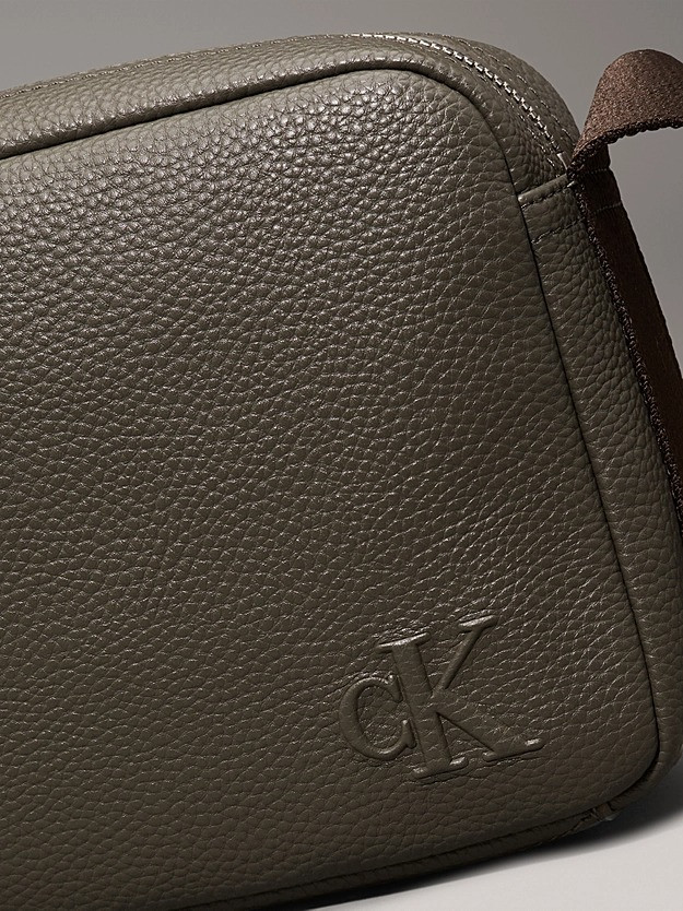 Minimalist and modern crossbody camera bag crafted from soft, grained faux leather. Features a Jacquard logo strap, adjustable length, and a matching CK monogram on the front.