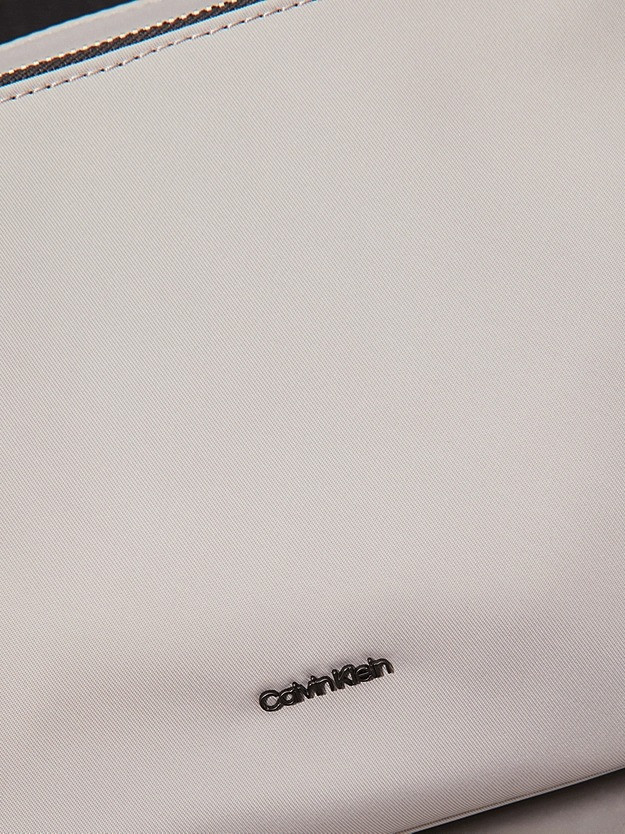 This Calvin Klein men's Crossbody Camera Bag is crafted from 59% recycled REPREVE® polyester, a durable soft fiber made from certified recycled plastic bottles. The design includes a faux leather trim, an adjustable shoulder strap (length: 29 cm – 65 cm), a zippered main compartment, magnetic and zip front pockets, an exterior slip pocket at the back, and an interior slip pocket. Features the Calvin Klein minimal metal logo on the front.