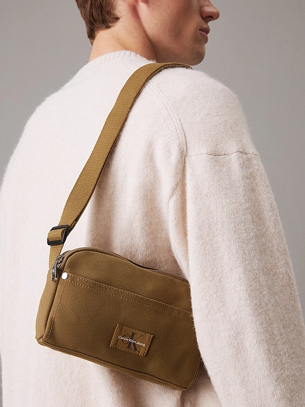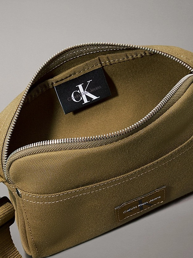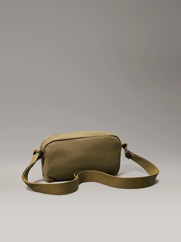 Compact crossbody bag made from 100% recycled polyester canvas (excluding trims). Features an adjustable shoulder/crossbody strap, top zip closure, front exterior pocket, and a worker-style design with a signature Calvin Klein logo patch.