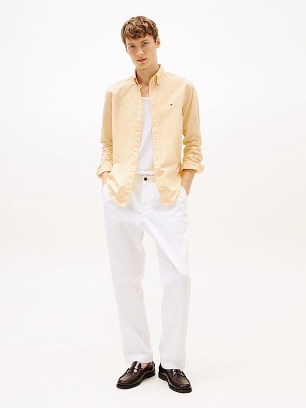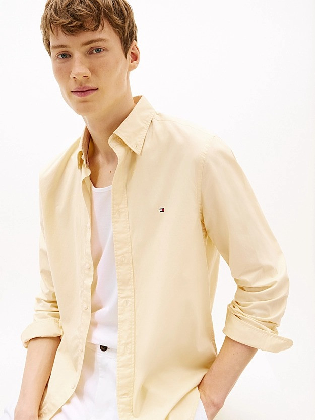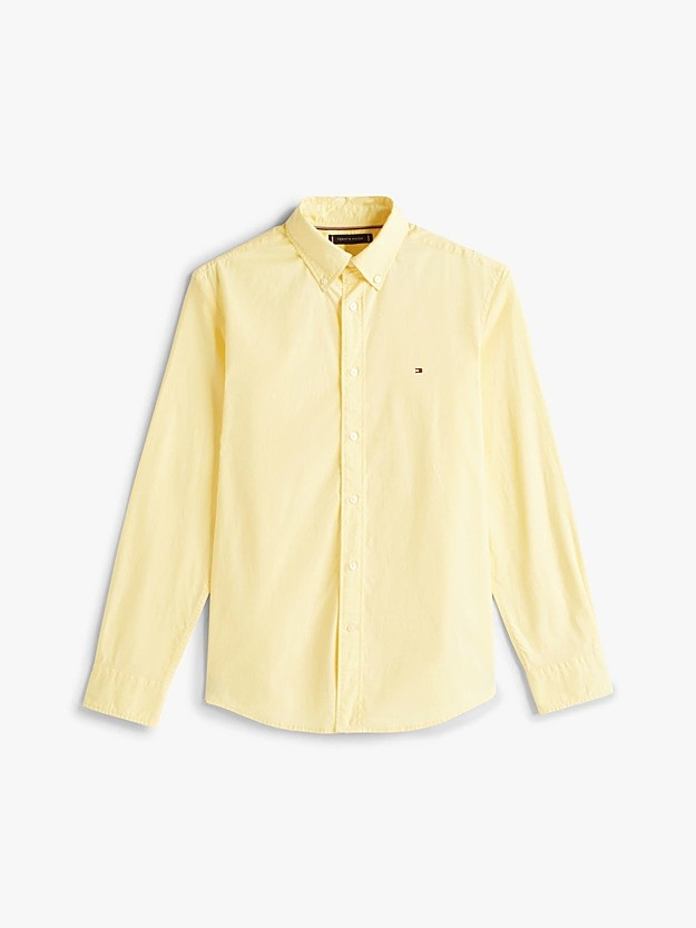 Product Description: This Tommy Hilfiger Regular Fit shirt is made from peached cotton poplin and enhanced with Flex Technology, ensuring excellent freedom of movement all day long. It features a button-down collar, rounded button cuffs, curved hem, and Tommy tape on the inside neckline. Finished with signature Tommy Hilfiger flag embroidery on the chest.