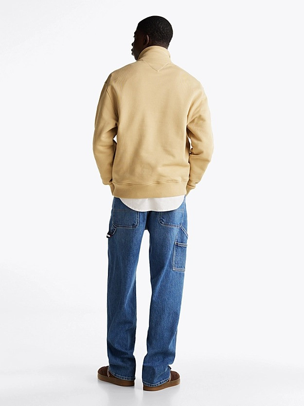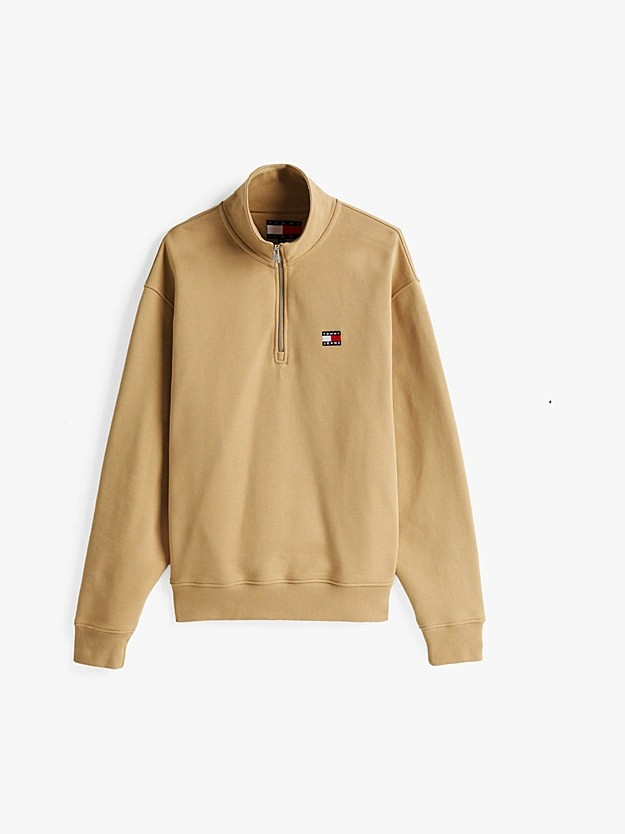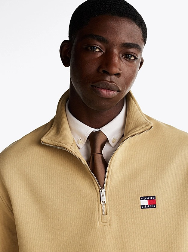 Product Description: This cotton sweatshirt features a mock-roll collar with a half-length zipper, giving it a timeless athleisure silhouette. Designed with rib-knit collar, cuffs, and hem, and finished with a Tommy Badge on the chest and Tommy Jeans branding.
