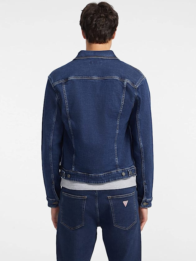 A classic slim-fit trucker jacket with button fastening, crafted from signature GUESS JEANS woven stretch denim with GUESS AIRWASH™ finish.