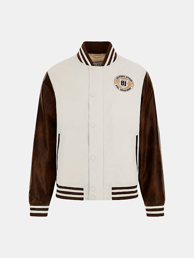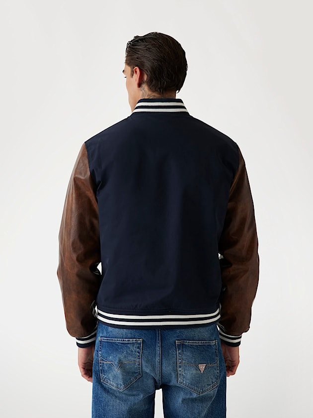 A varsity-style jacket with a twill body and contrast long sleeves.