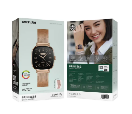The Green Lion Princess Smart Watch is elegant and caters to almost every need, from style to functionality. Constructed from zinc alloy, it adds tremendous strength and durability. At the same time, its major selling point is an IP68 rating that helps the Water and Dust Resistance feature, making it an adorable piece for daily status. On the other hand, it provides Bluetooth 5.2, high-fidelity Bluetooth calling with notifications for calls and social apps, meaning that it keeps the user connected even while on the move. In terms of health features, this smartwatch includes female health tracking, sleep tracking, blood pressure monitoring, and sedentary reminders. With over 100 sports modes, music control, a raised wrist wake screen, and customizable dials, this smartwatch is the perfect ally in achieving your fitness goals! Powered with a 210mAh battery, it supports 3 to 7 days of usage, and the magnetic pin charging makes it even more convenient.