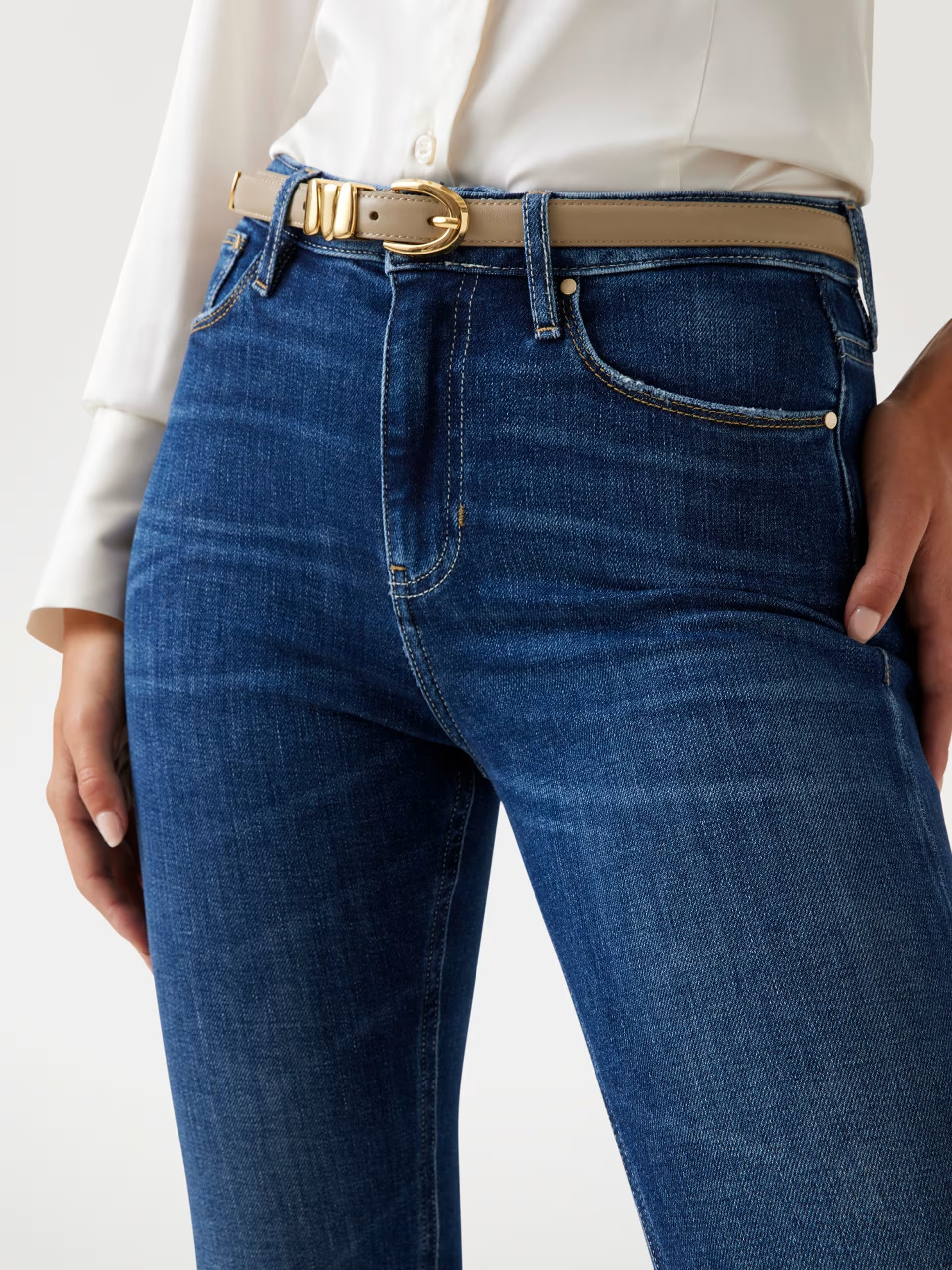 Step into style with these chic jeans that offer both comfort and flair. Made from a stretch cashmere/cotton blend, the high-rise fit with five pockets ensures a perfect silhouette. The stylish flared leg enhances your look. Featuring recycled cotton fibers, perfect for everyday elegance.