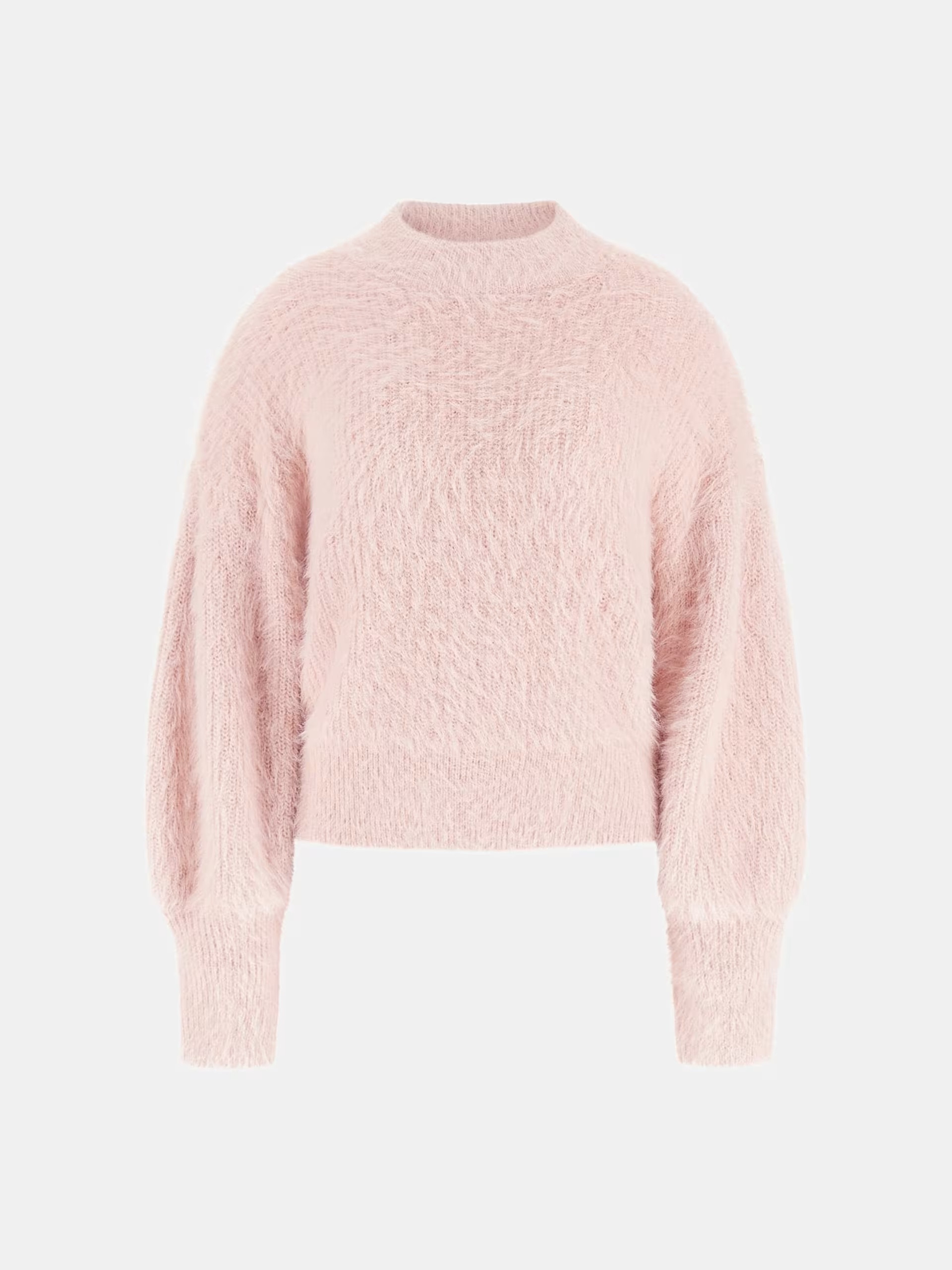Embrace cozy elegance with this fuzzy yarn sweater. The mock turtleneck and long sleeves add a touch of sophistication. Rib knit accents create a relaxed fit for everyday style. Perfect for layering, it seamlessly transitions from boardroom to brunch, highlighting effortless charm.