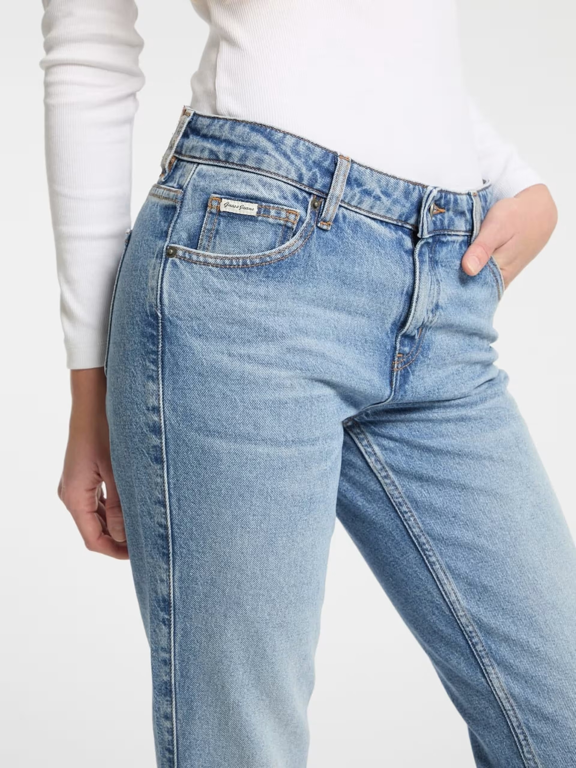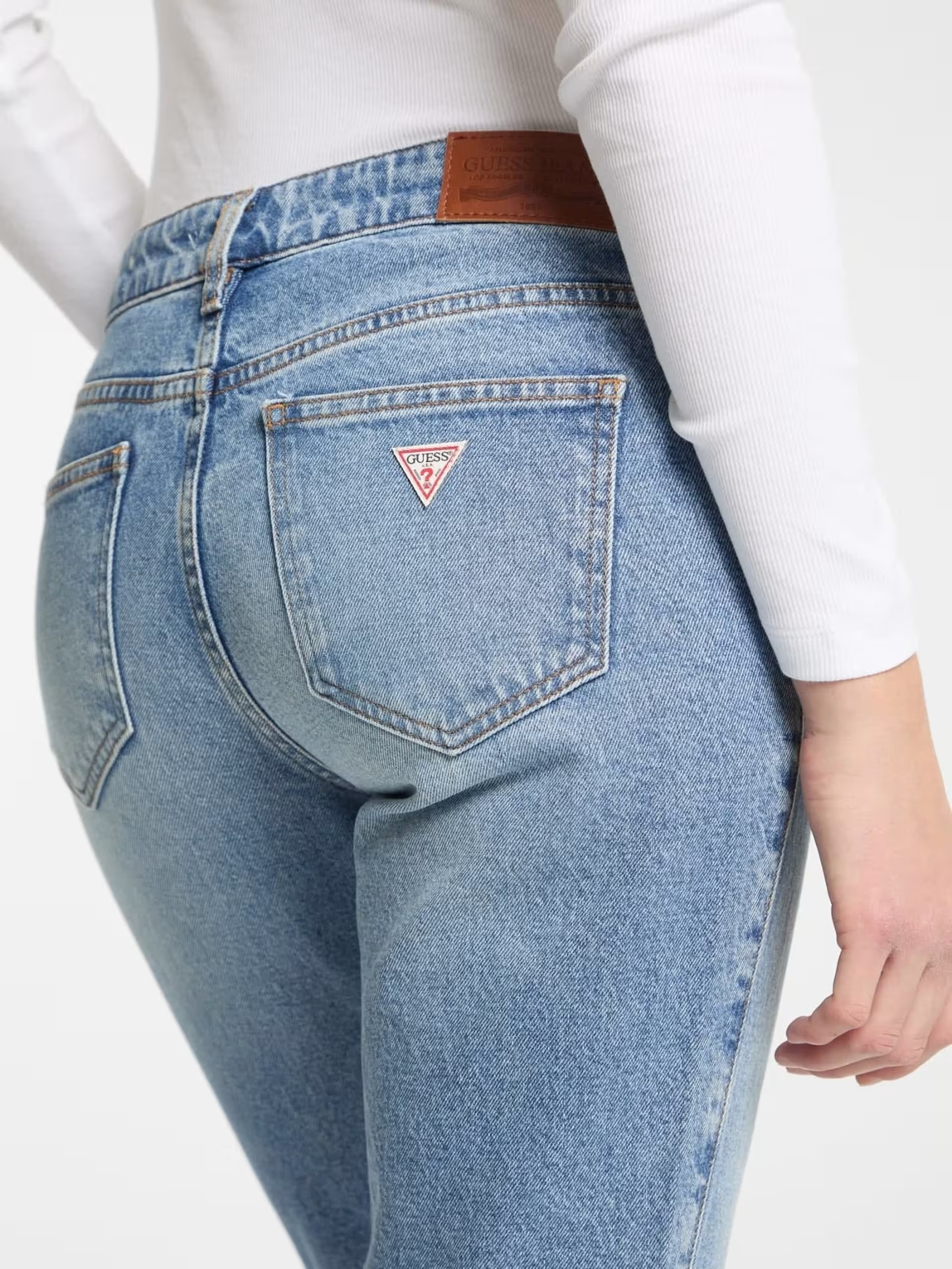 • Stretch-denim bootcut jeans in a light indigo wash.