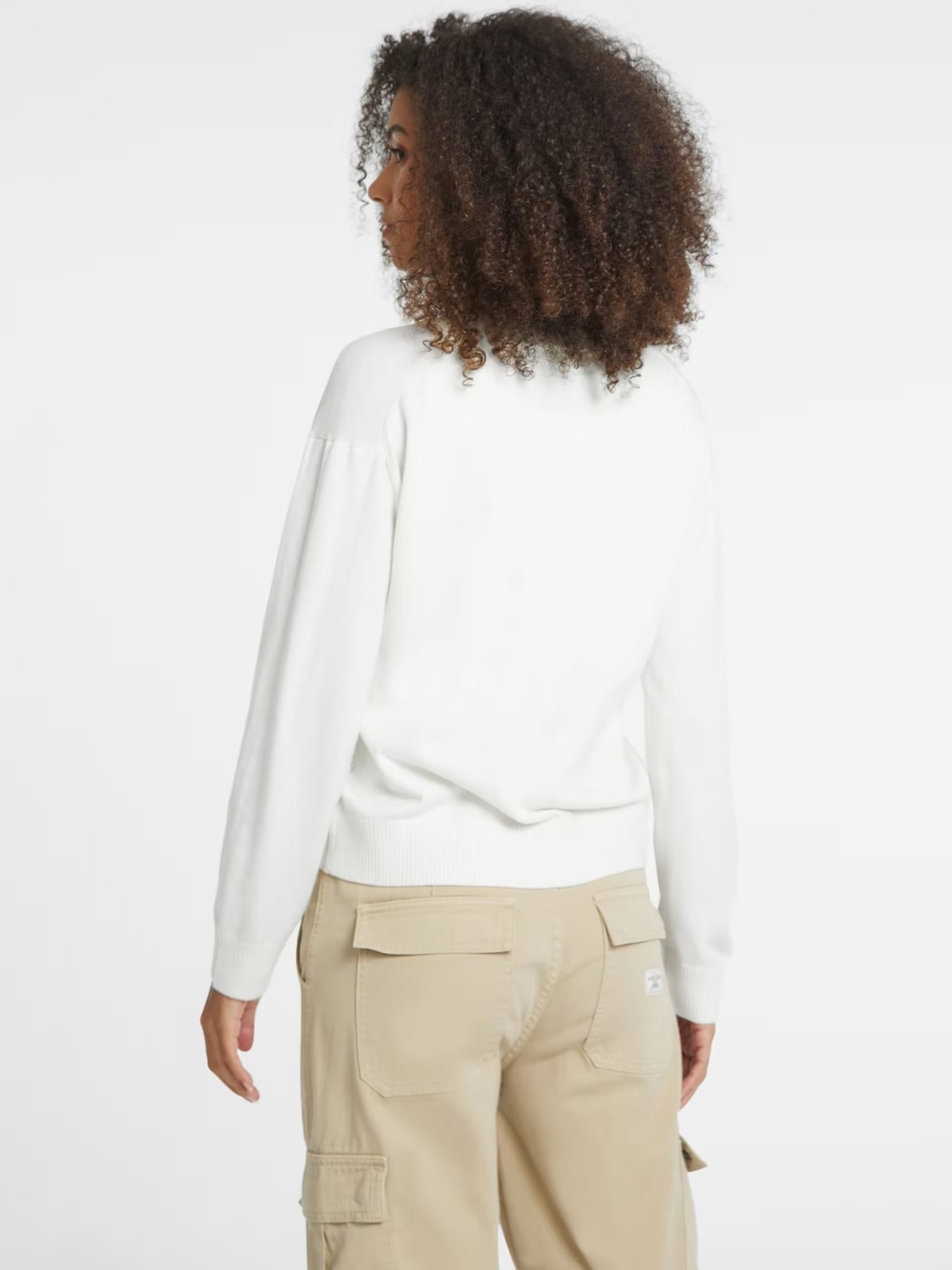 Classic meets modern edge. V-neck and mini logo offer elegance with a dash of creativity, offset by long sleeves and dropped shoulders. Ribbed trims and cropped length enhance the chic appeal. This item is made with recycled components