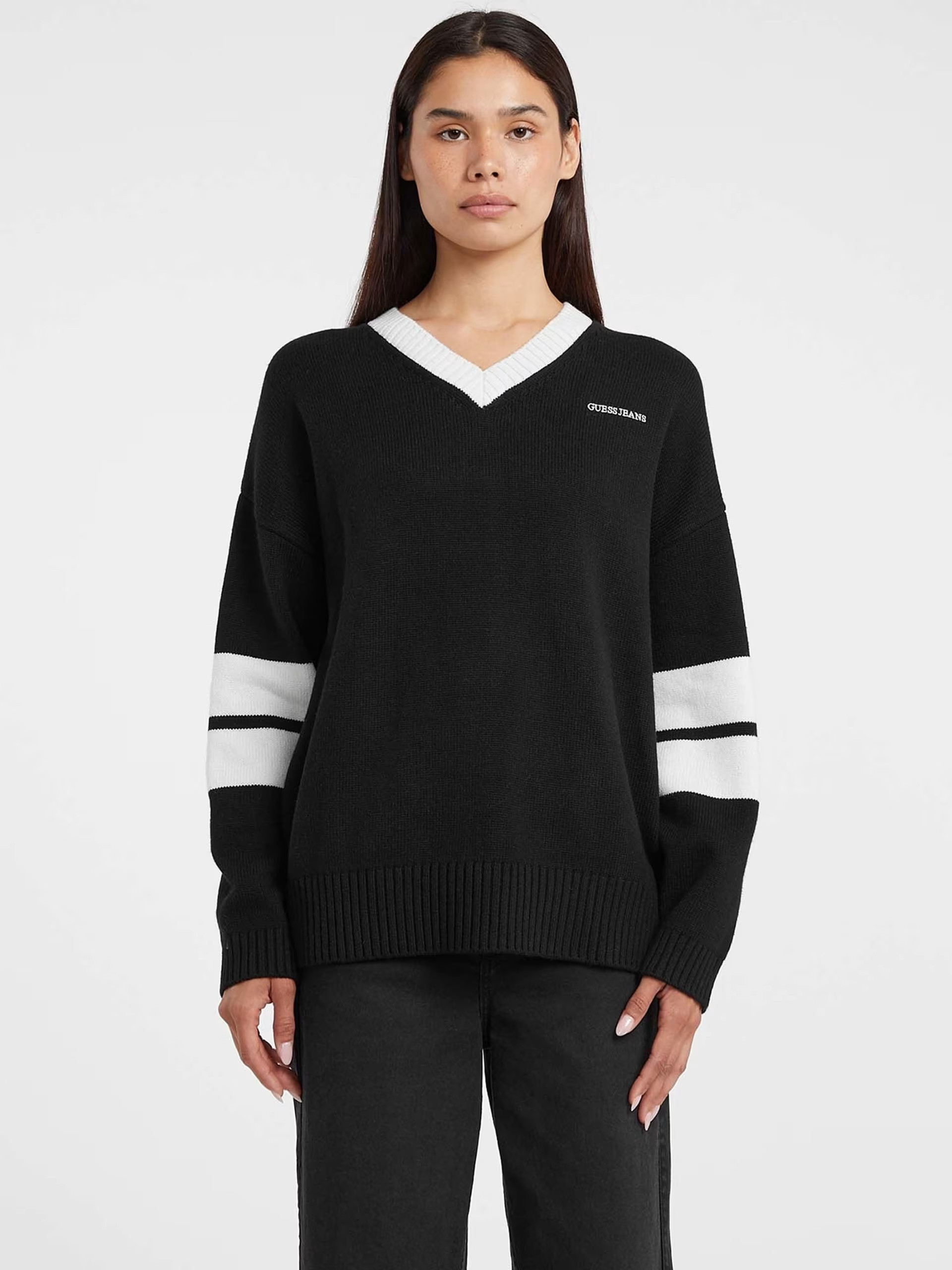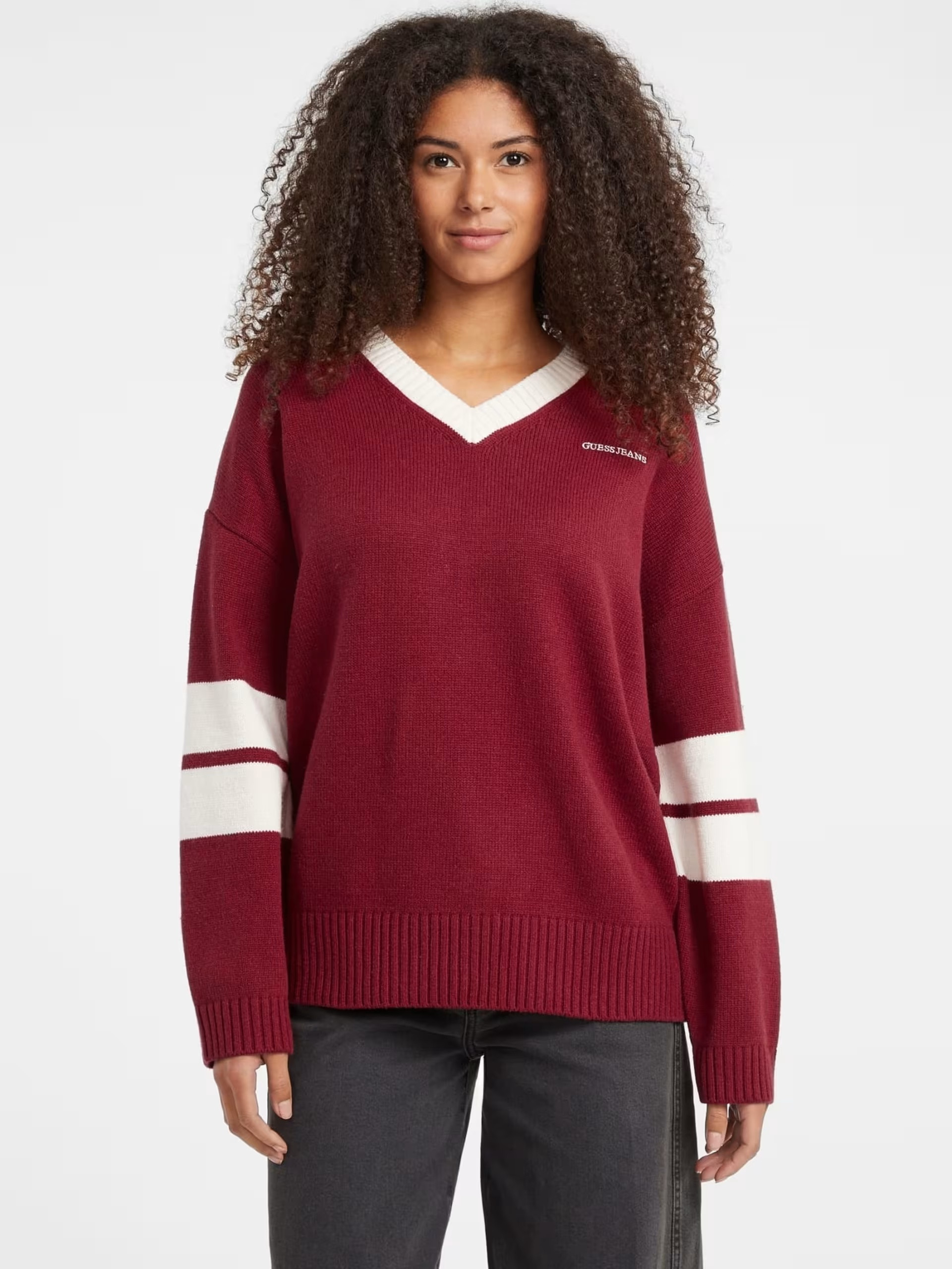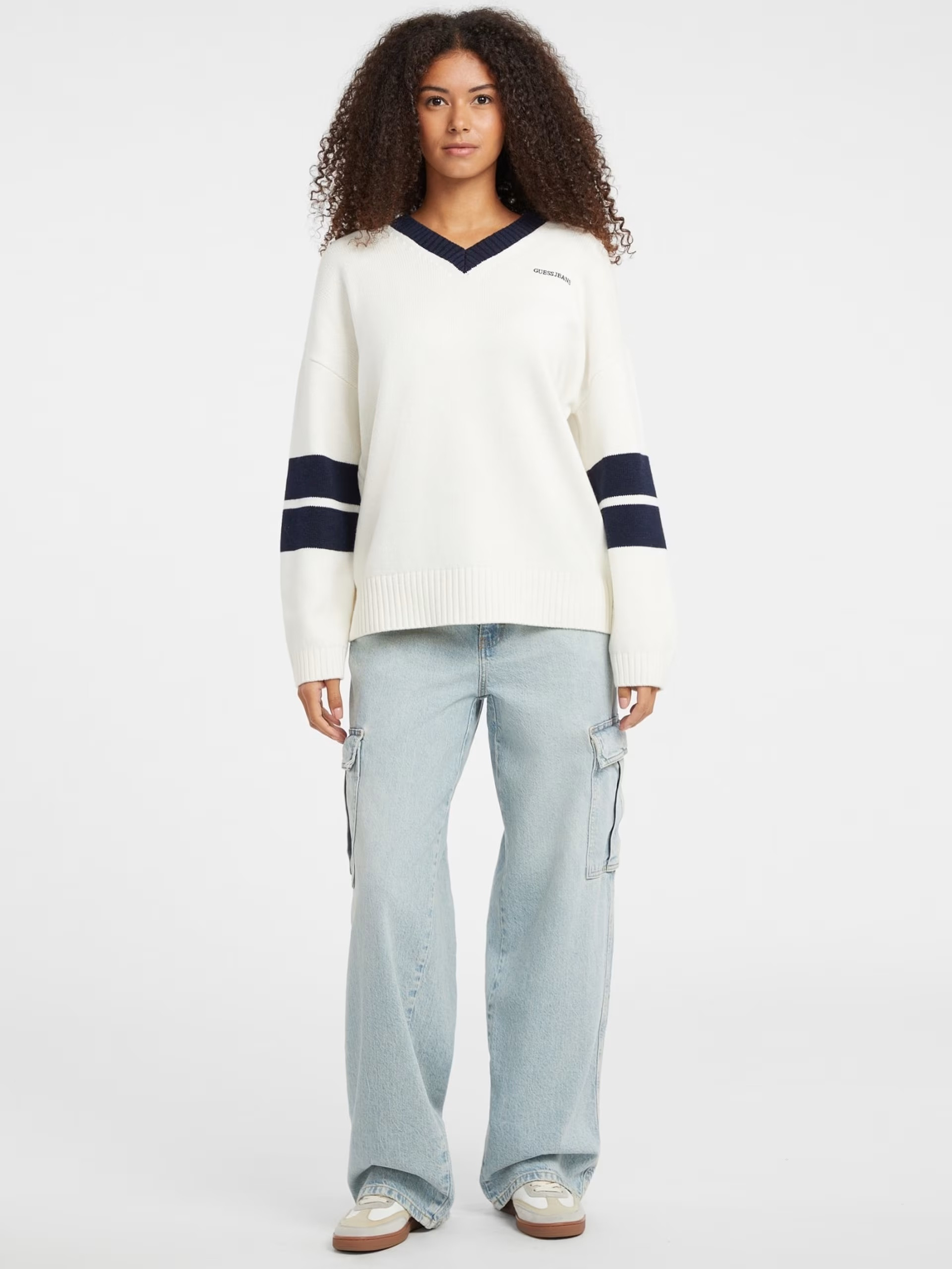 Effortless style meets cozy charm. V-neck and long sleeves offer relaxed sophistication. Embroidered logo adds a sleek touch. This item contains organic cotton fibers.