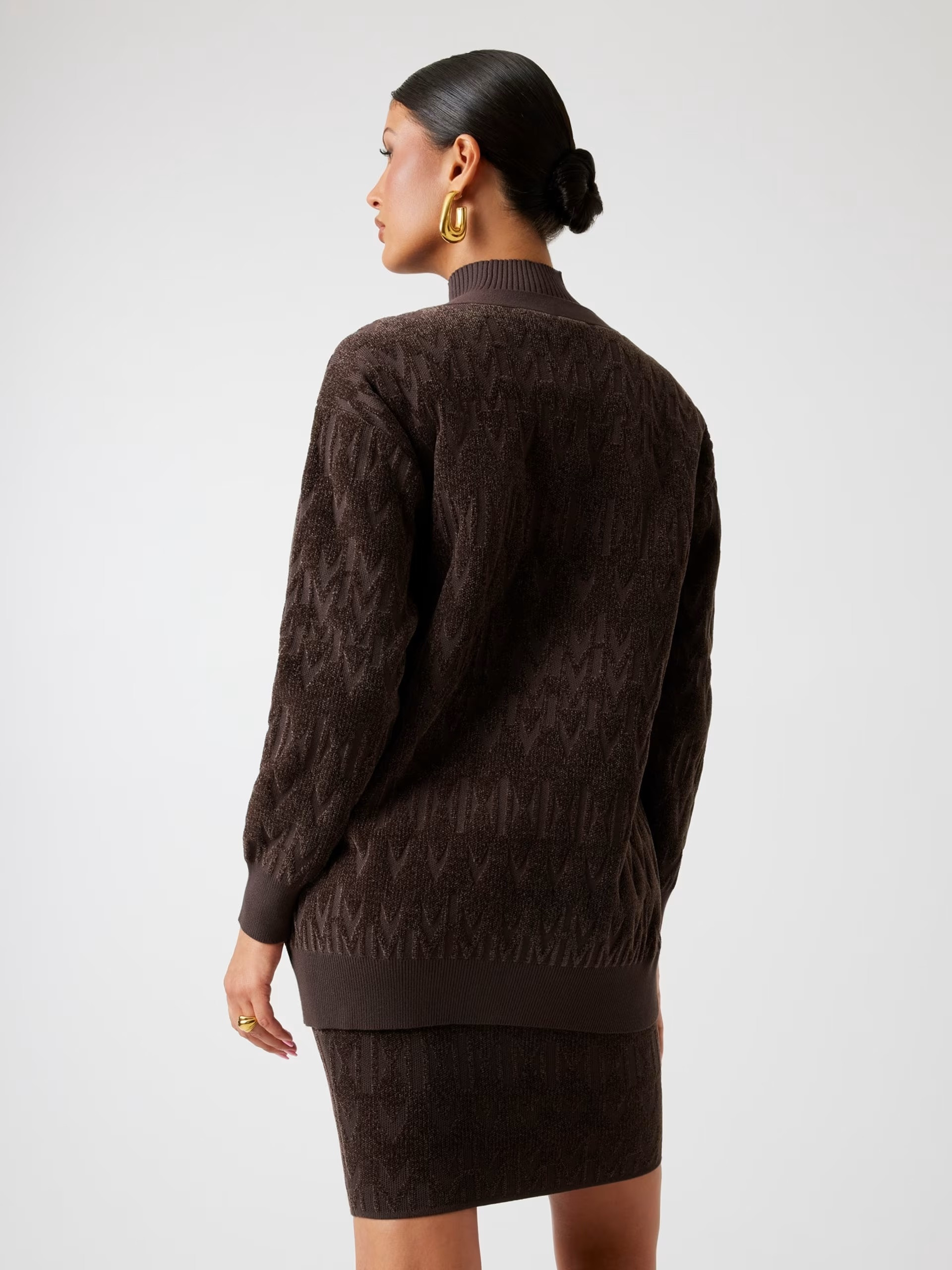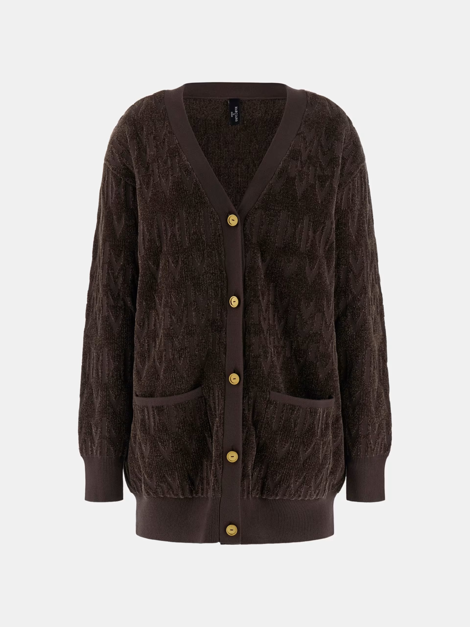 Wrap yourself in luxury with this chenille long cardigan. The all-over embossed monogram logo adds a touch of sophistication. Front patch pockets offer practical elegance. Perfect for office wear or a chic weekend ensemble.