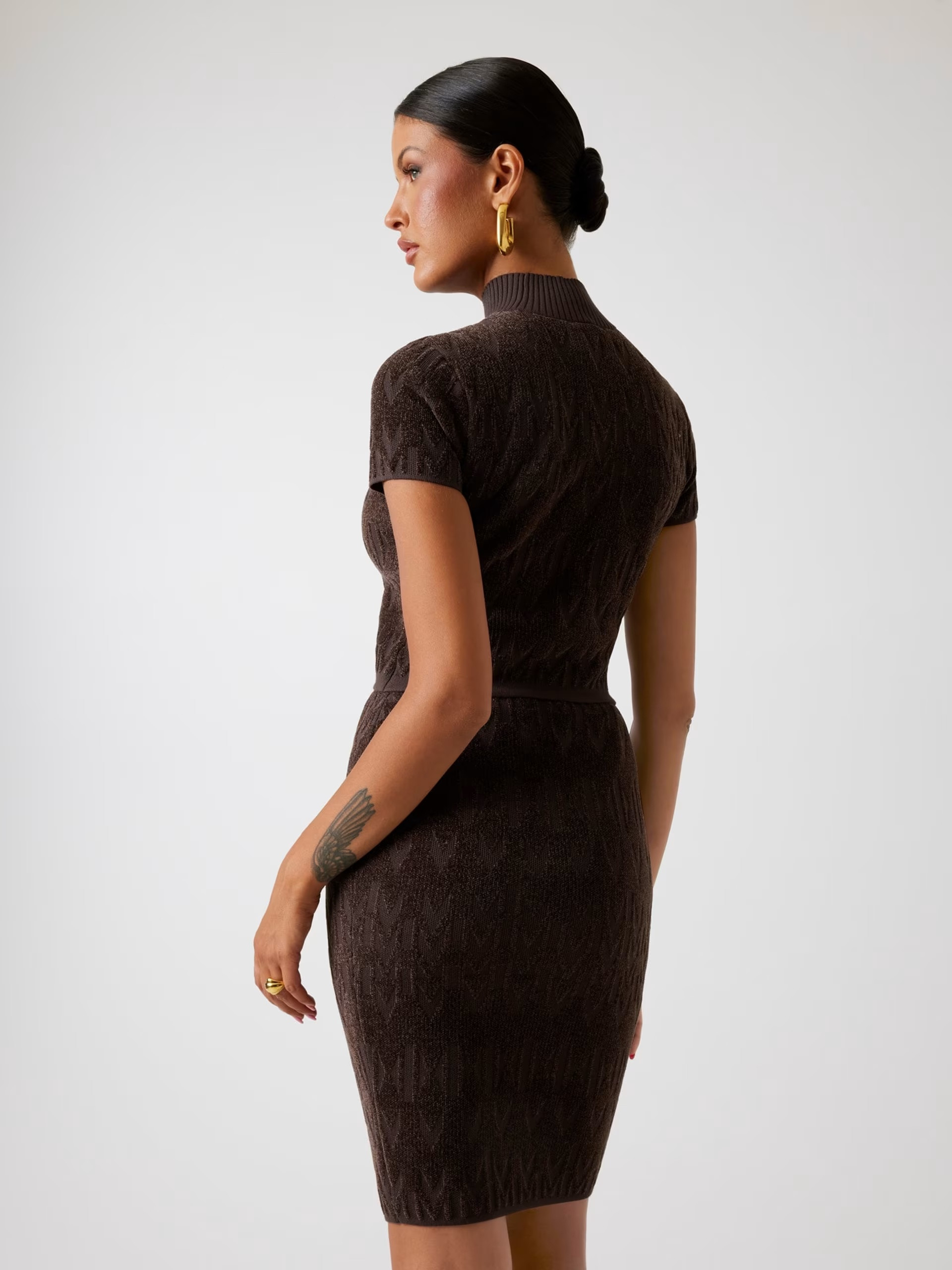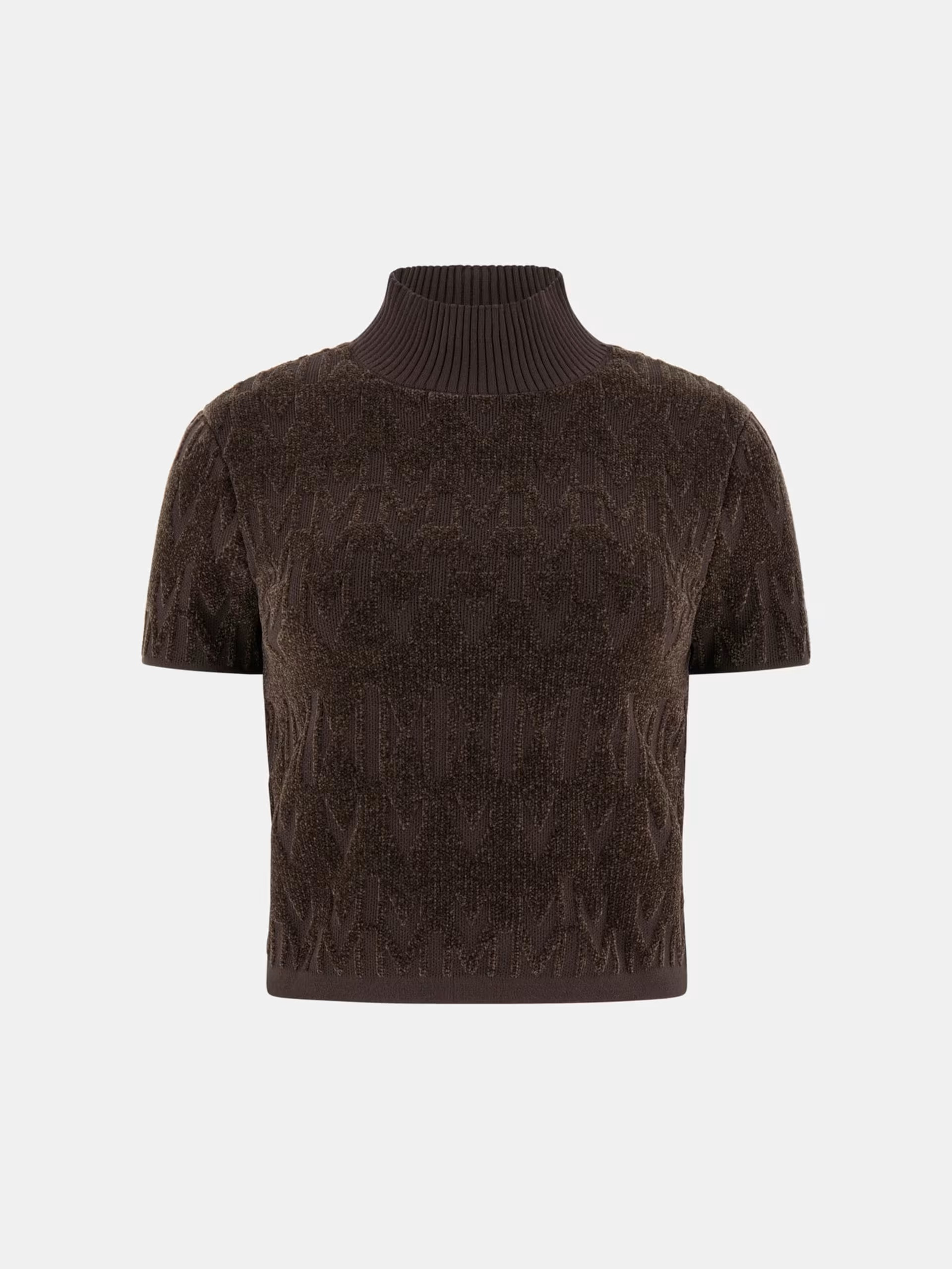 Step into sophistication with this viscose-blend chenille sweater top. The rib-knit mock neck pairs beautifully with the embossed monogram design, elegantly defining your shape. Perfect for a classic fit, this piece suits office wear or evening outings.