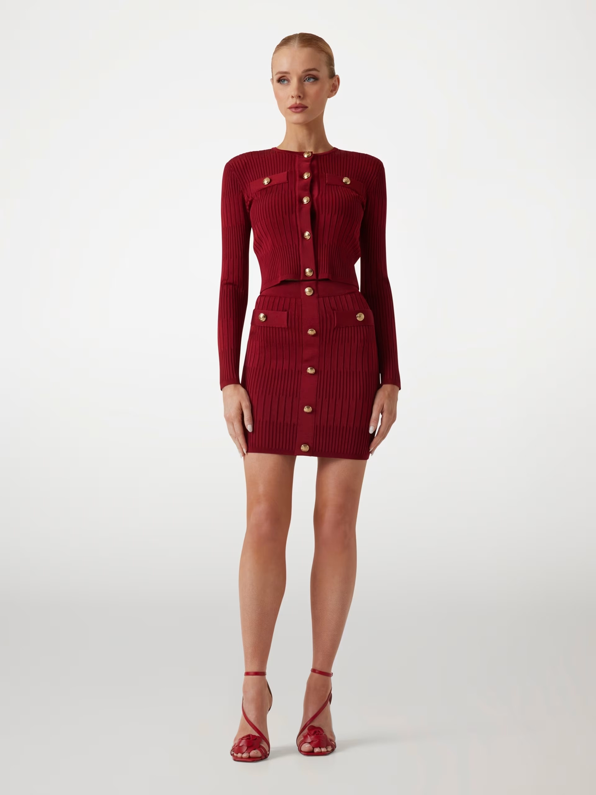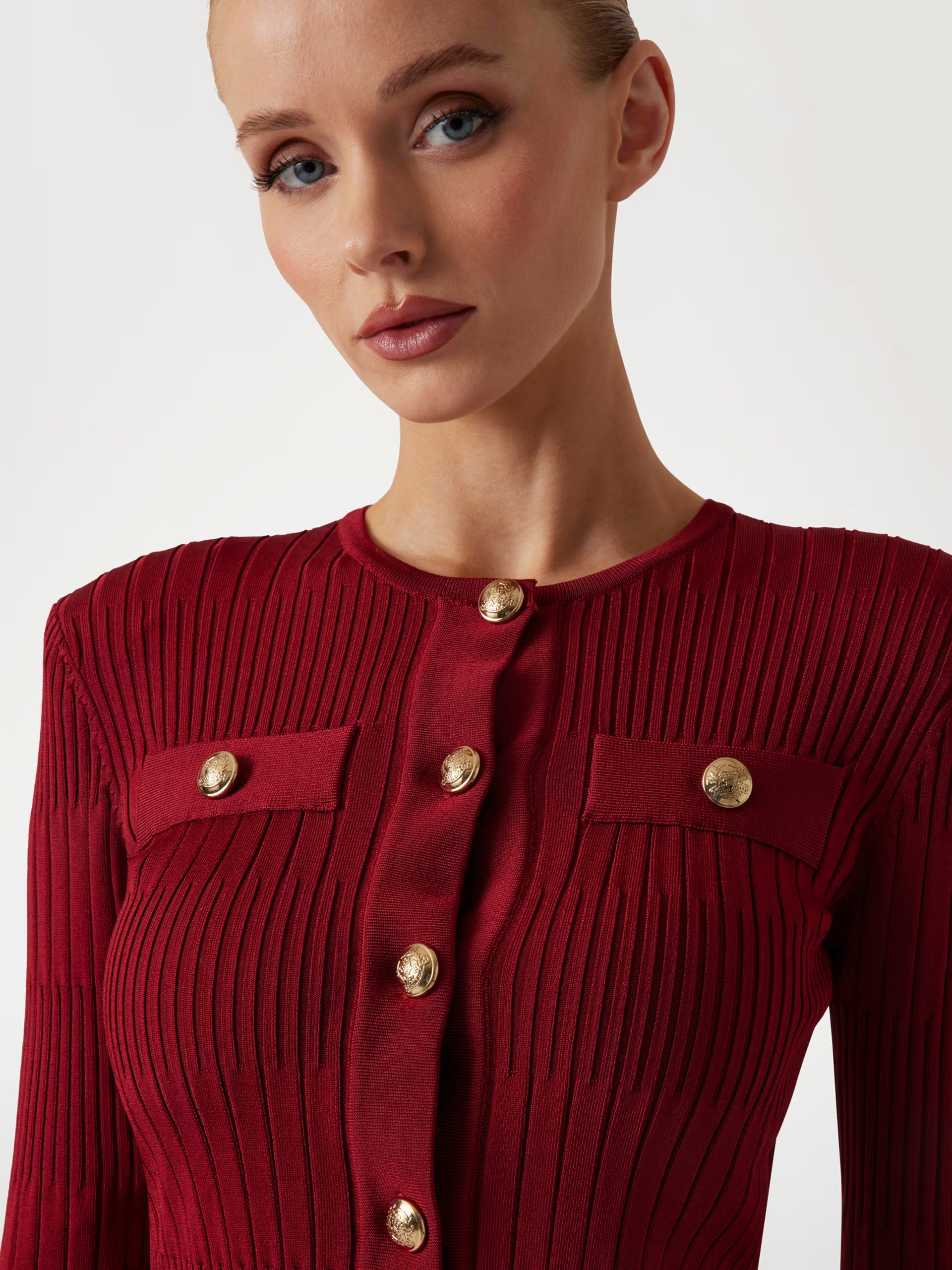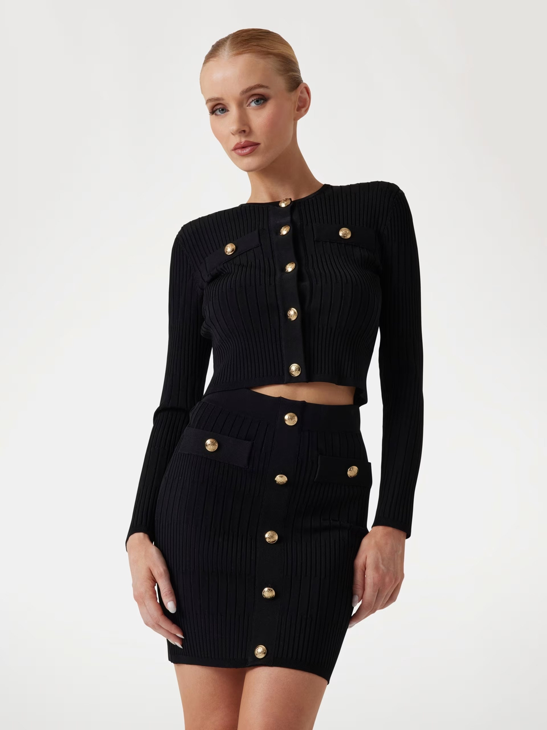 Awaken your charm with this stretch viscose-blend cropped cardigan. The classic rounded neckline and sleek long sleeves offer timeless elegance. Vertical ribbing throughout creates a chic effect, complemented by the luxurious jeweled button fastening. Perfect for elevating evening attire or a stylish work ensemble.