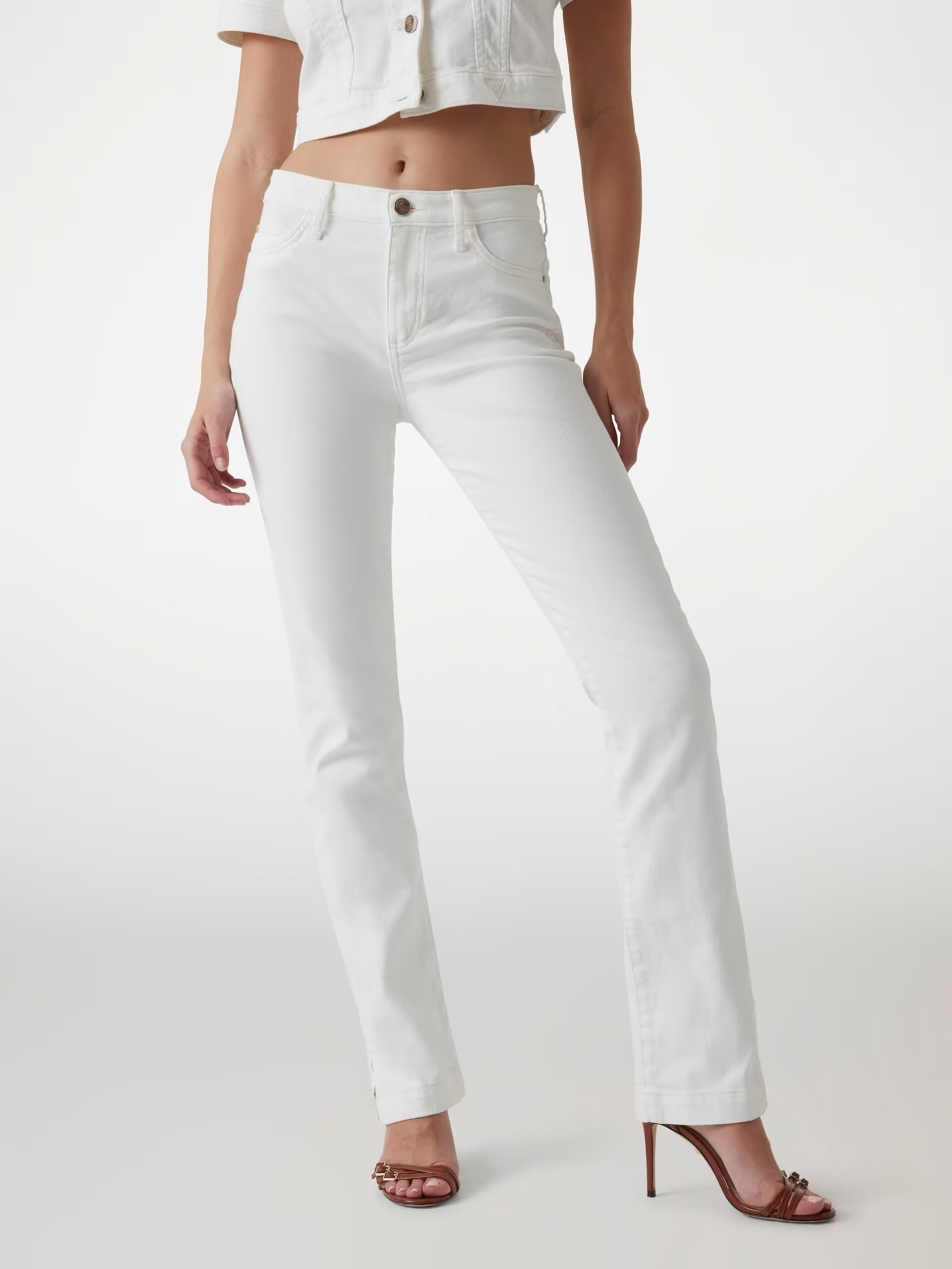 Step into elegance with these classic mid-rise jeans. Crafted from a comfortable stretch blend of cotton and Lyocell, featuring a sleek straight-leg cut and five-pocket design. Perfect for chic city outings or alfresco lunches. Enjoy the tailored fit with zip and button closure for any occasion.