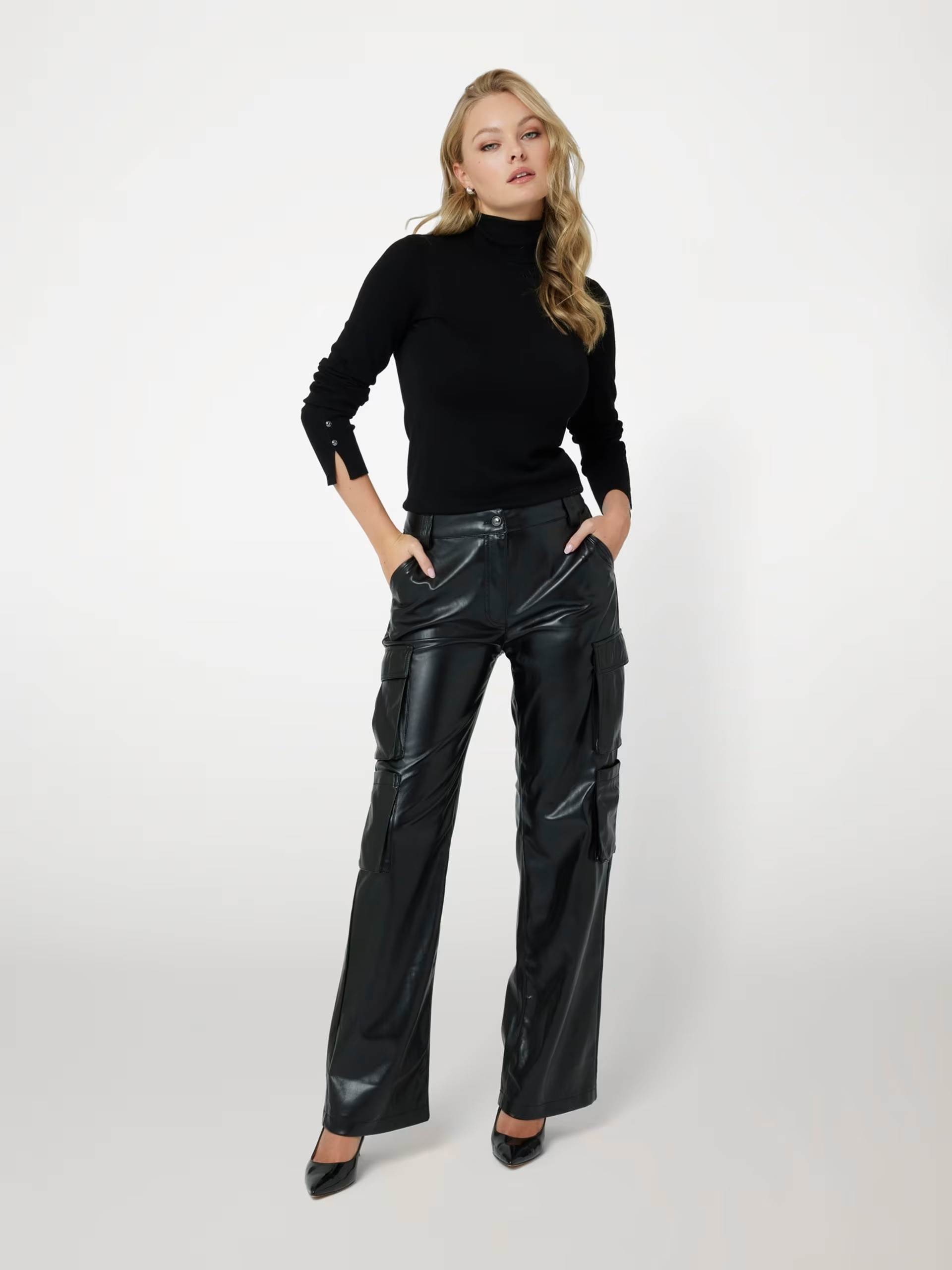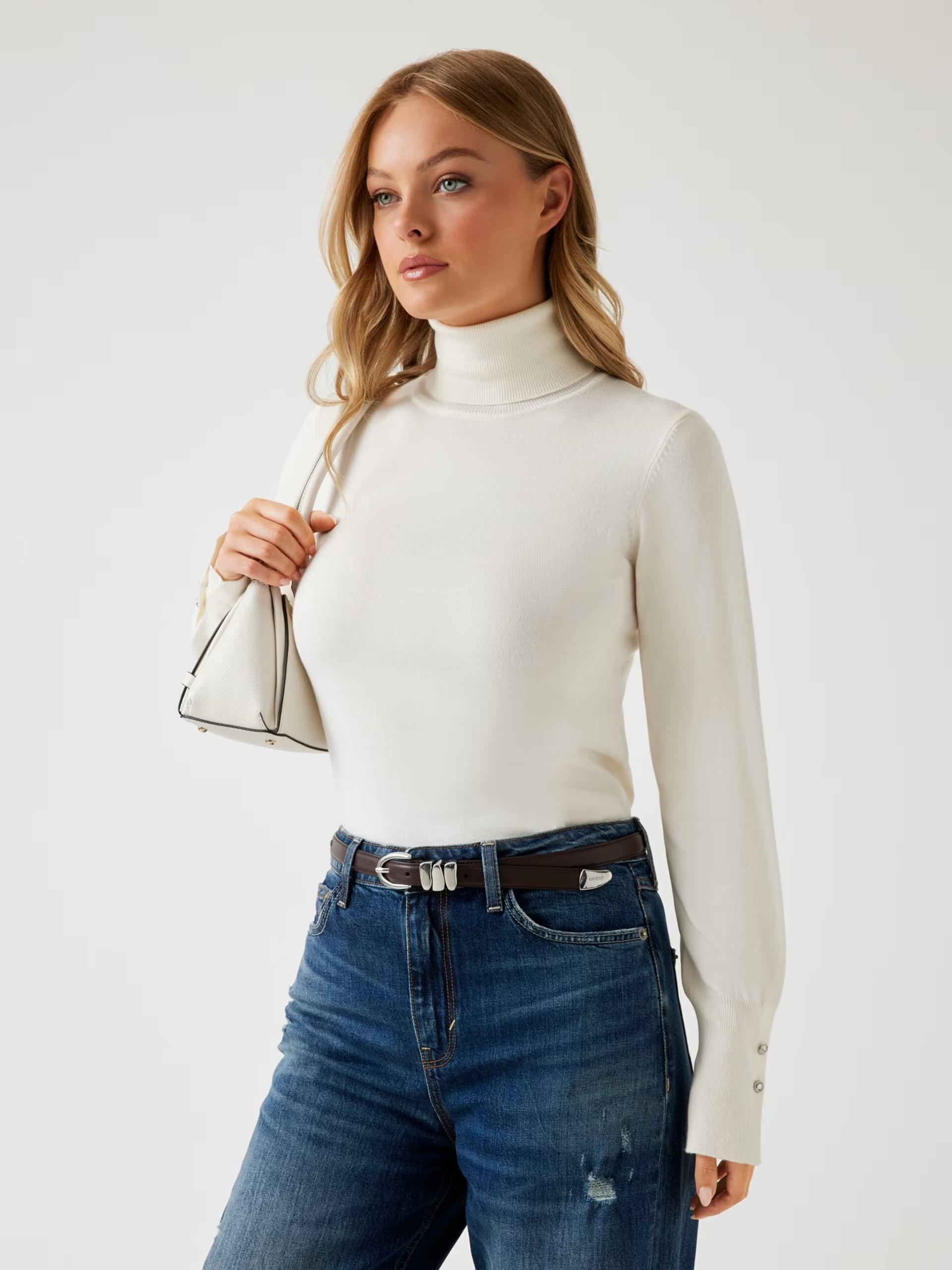 Step into style with this viscose blend sweater. The turtleneck and slim fit create a modern silhouette. Long sleeves with button details add a refined touch. Perfect for urban chic. Made using FSC-certified sustainable wood fibers.