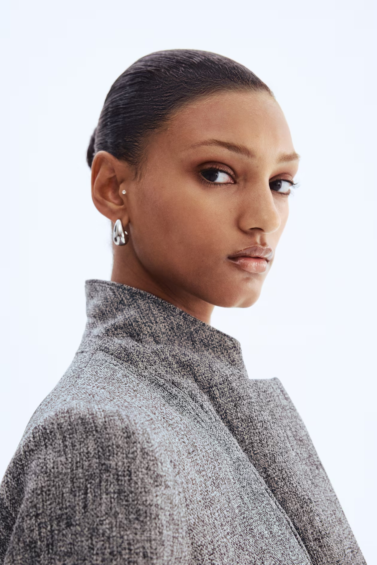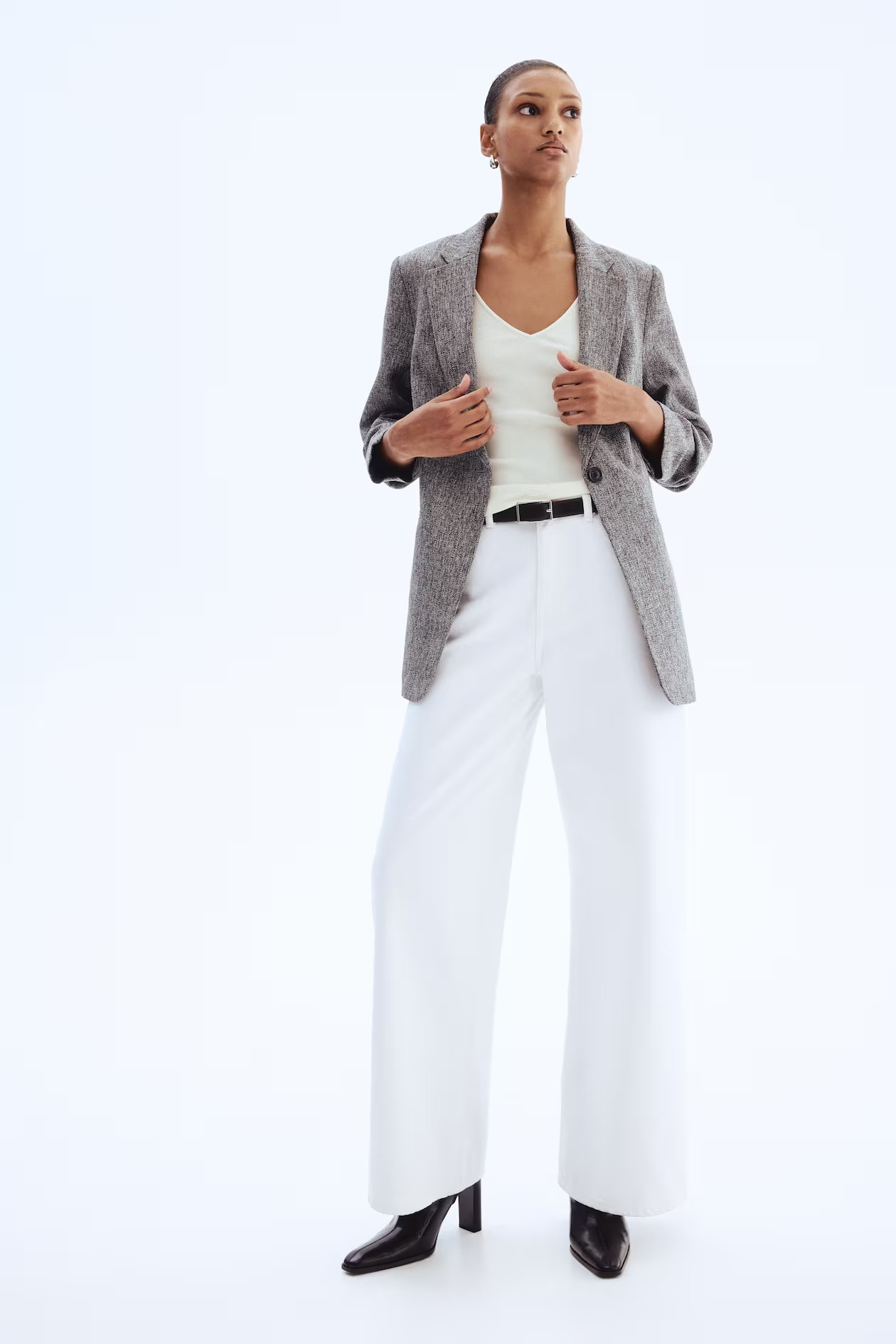 Long blazer in woven fabric with a lapel collar, one-button front closure, waist darts, and welt pockets. Padded shoulders and gathered 3/4-length sleeves. Lined.