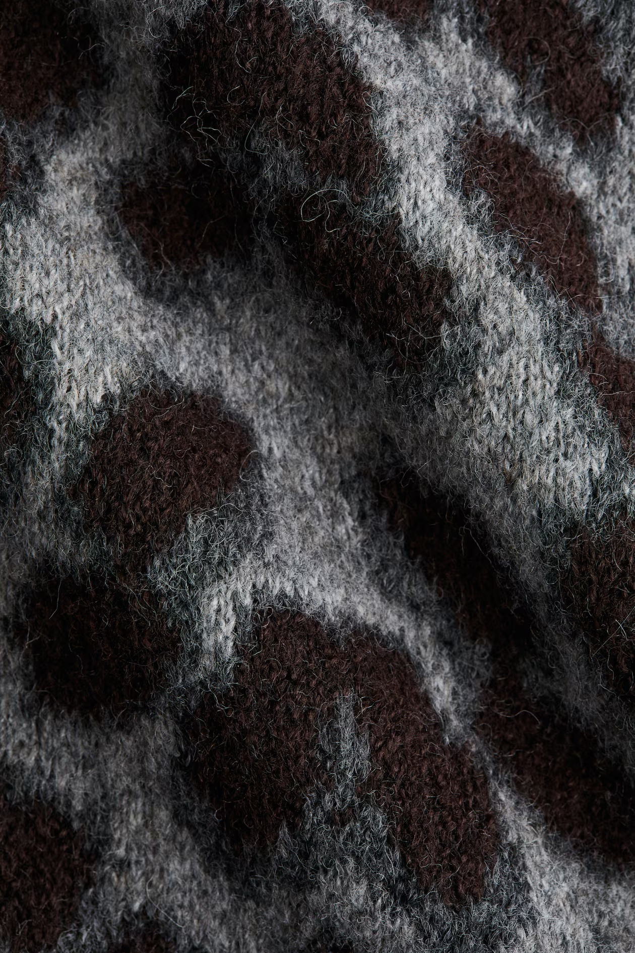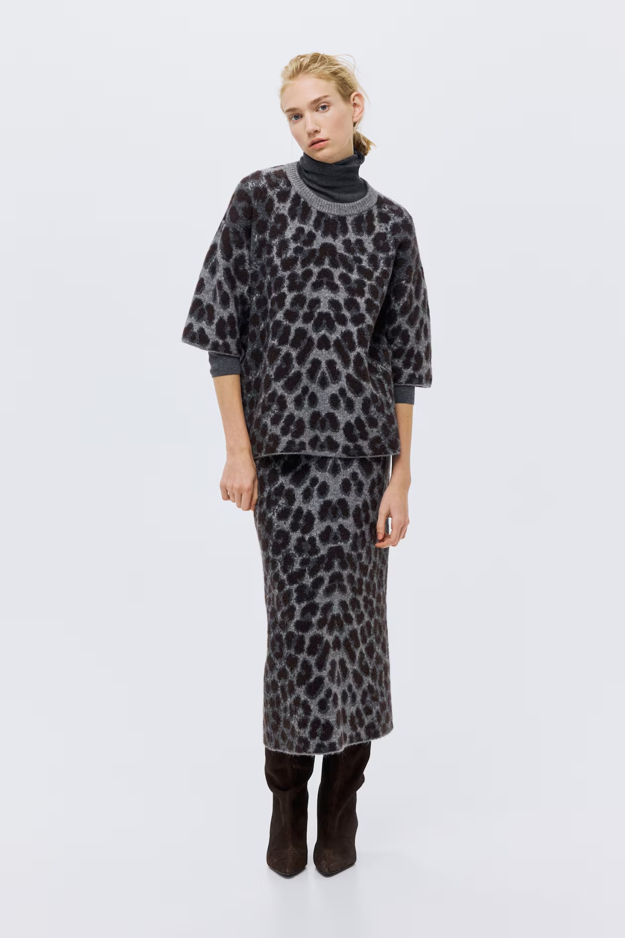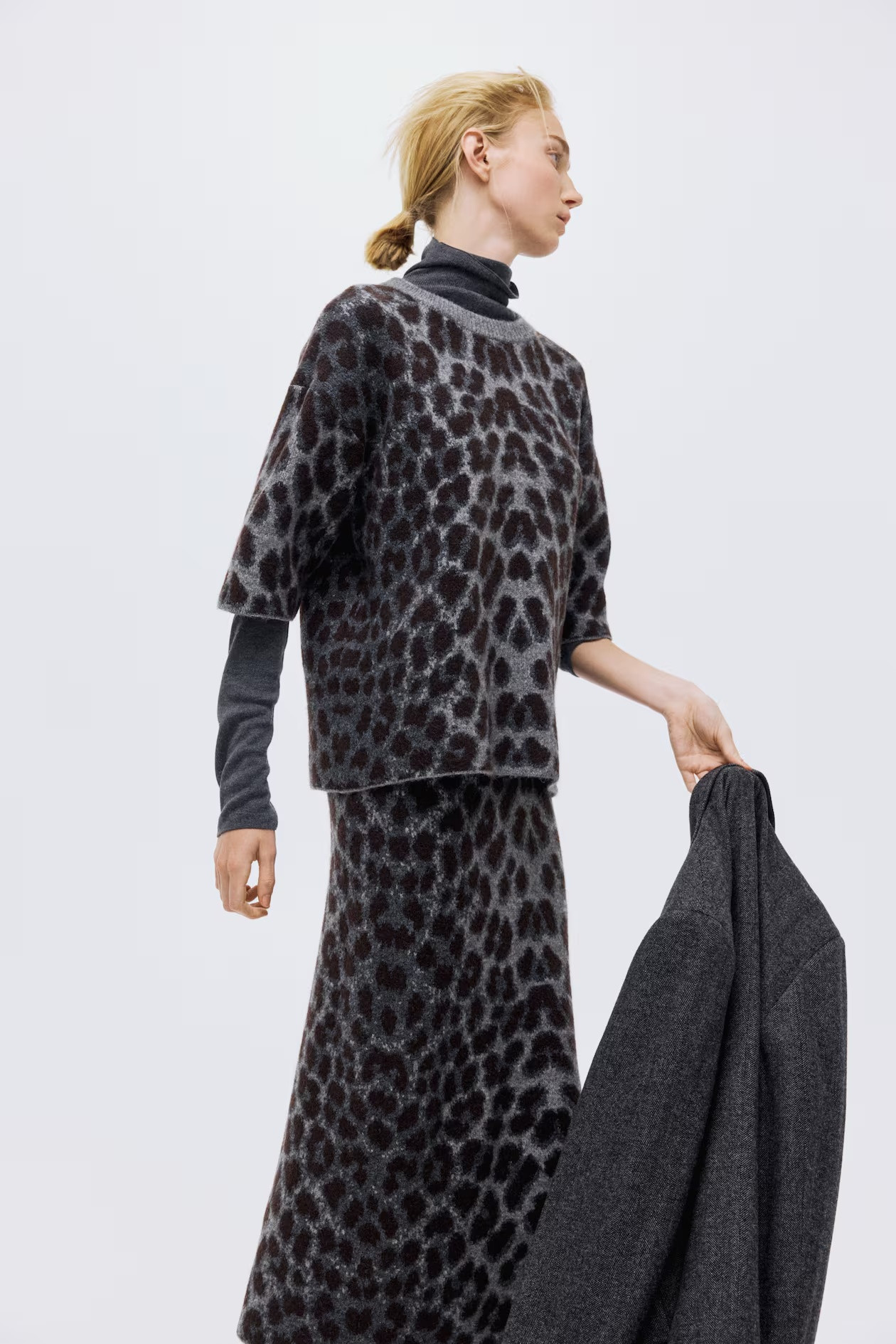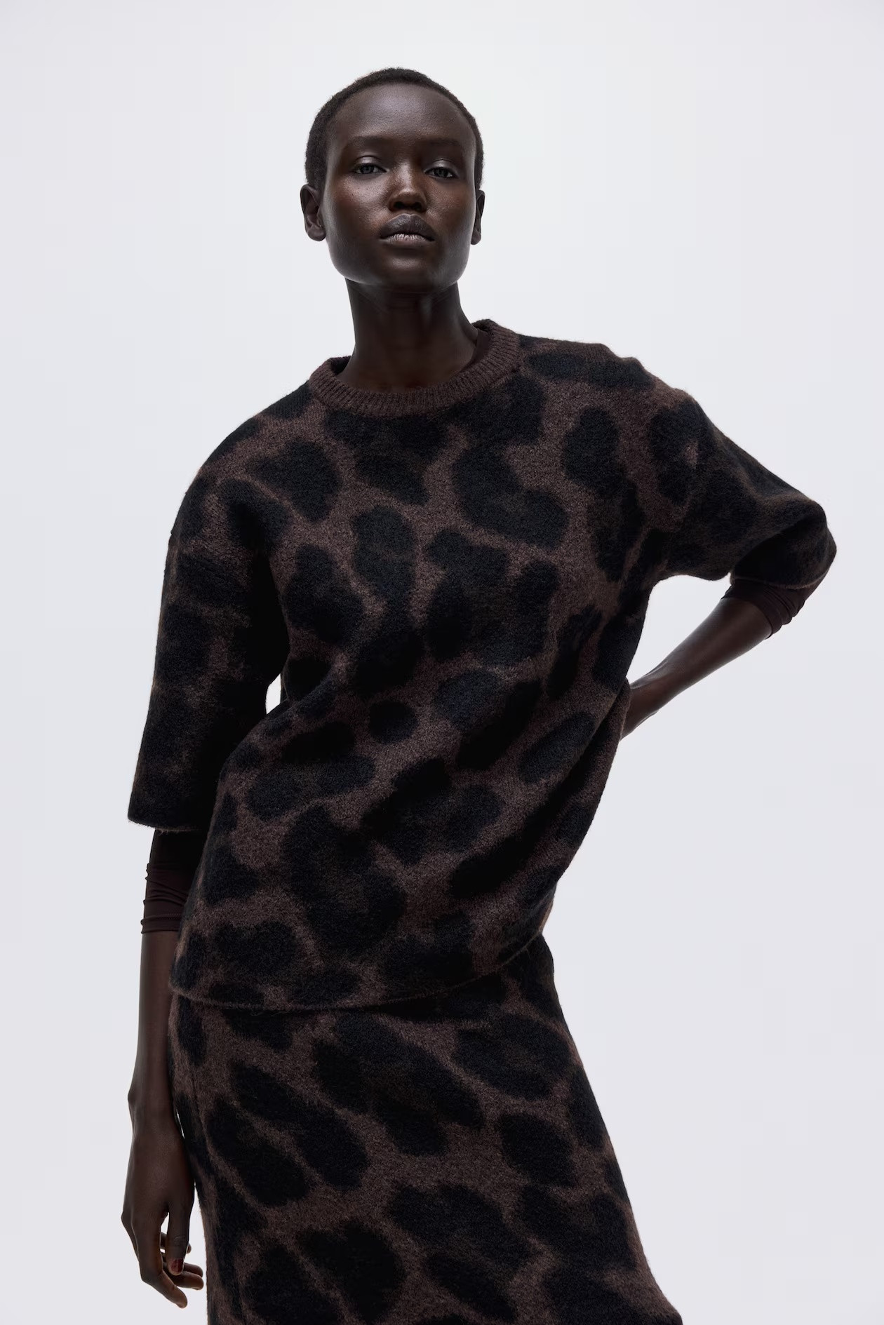 Boxy sweater in soft jacquard knit with a ribbed round neck, dropped shoulders, and elbow-length sleeves. Loose fit.