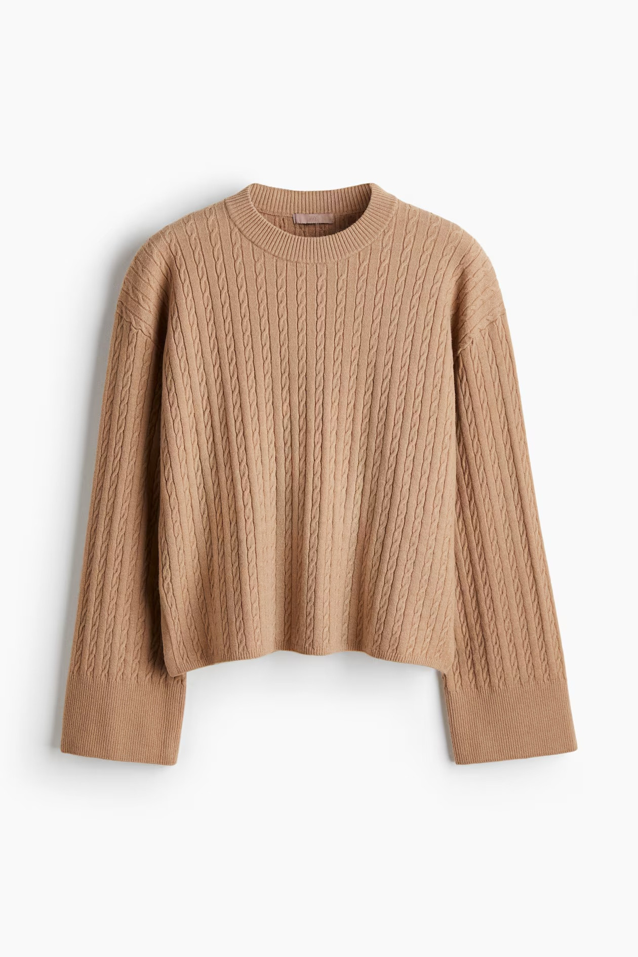 Sweater made of soft cable knit with a touch of wool. Ribbed round neck, dropped shoulders, and long, wide sleeves with ribbed cuffs. Straight hem with side slits.