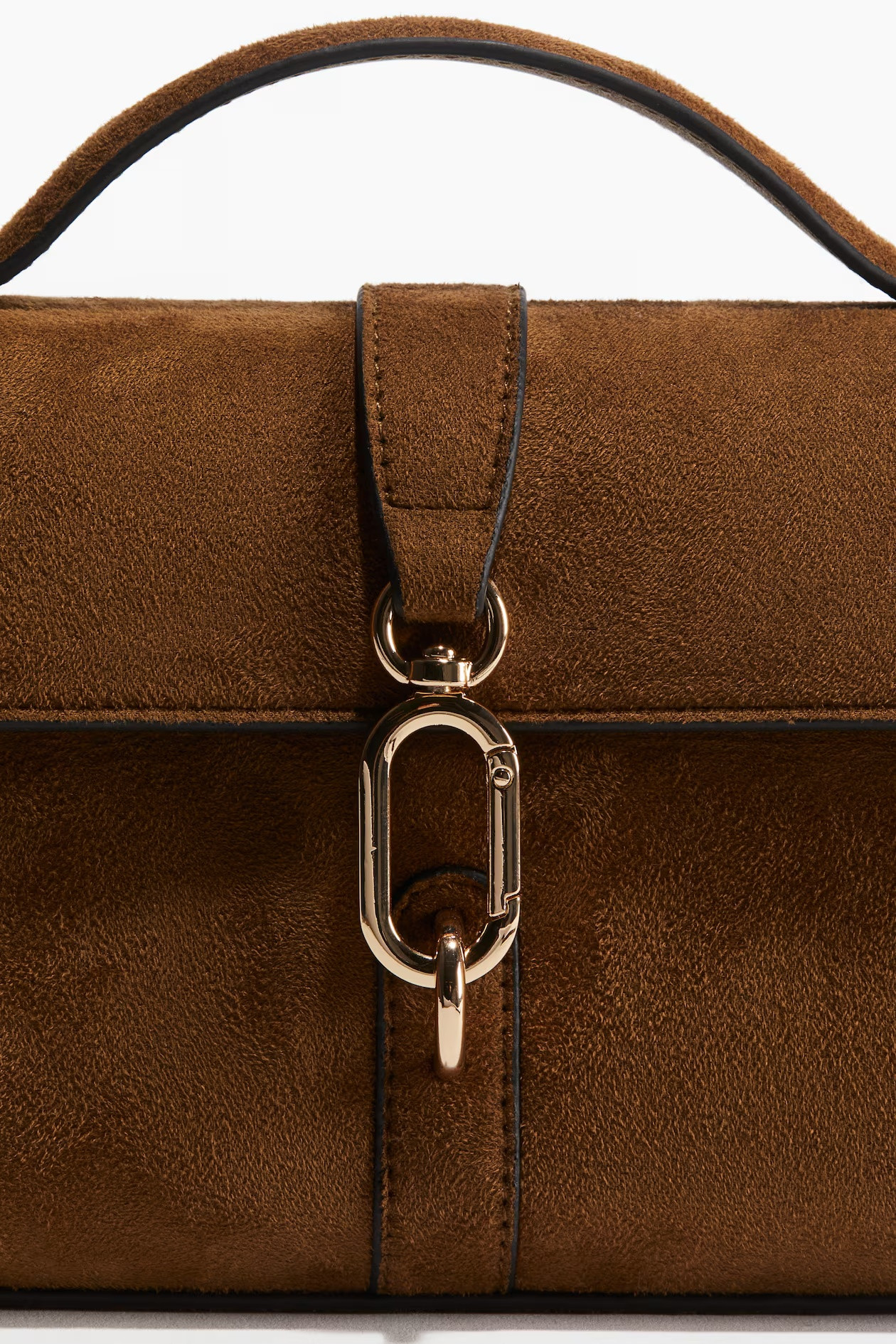 Crossbody bag with a soft, napped finish featuring a handle and an adjustable shoulder strap with a metal buckle. Flap with an oval carabiner hook at the front. Lined. Depth 5 cm. Height 15 cm. Width 22 cm.