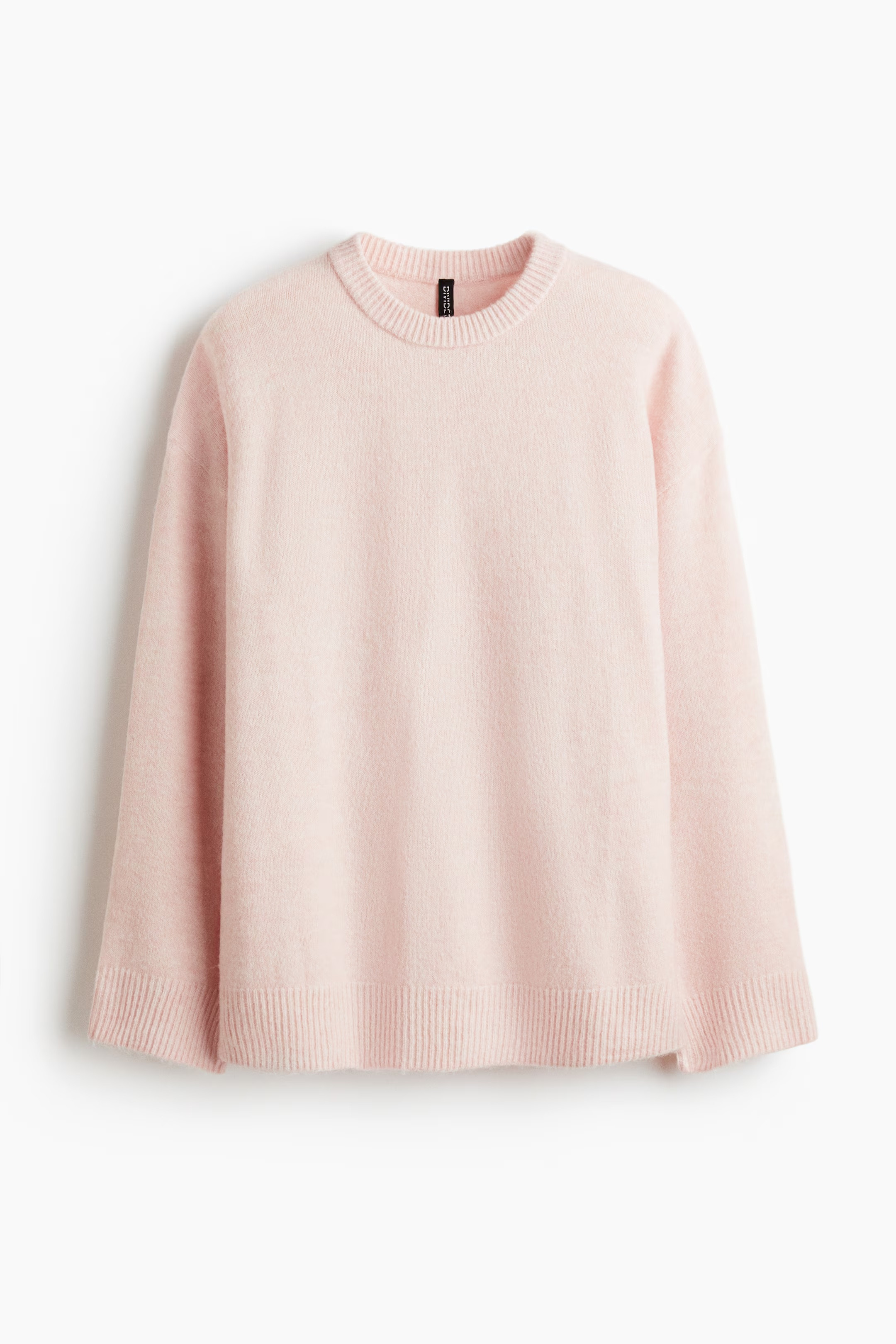A loosely fitting sweater made from soft knit fabric with a wool blend. Features a round neck, dropped shoulders, and ribbed cuffs and hem.