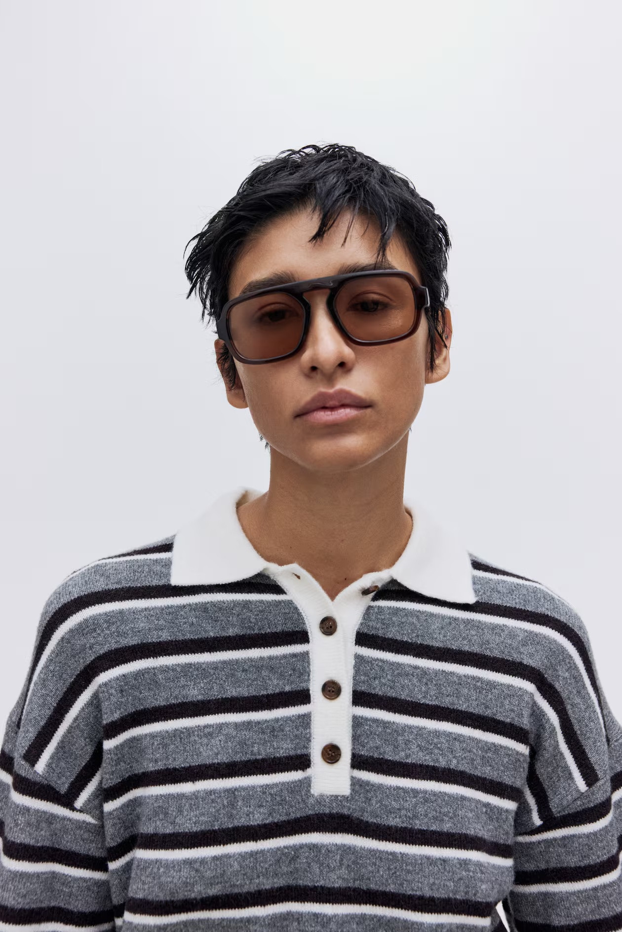 Short, oversized sweater made of soft knit with a collar, button placket, dropped shoulders, and tapered sleeves. Ribbed cuffs and hem.