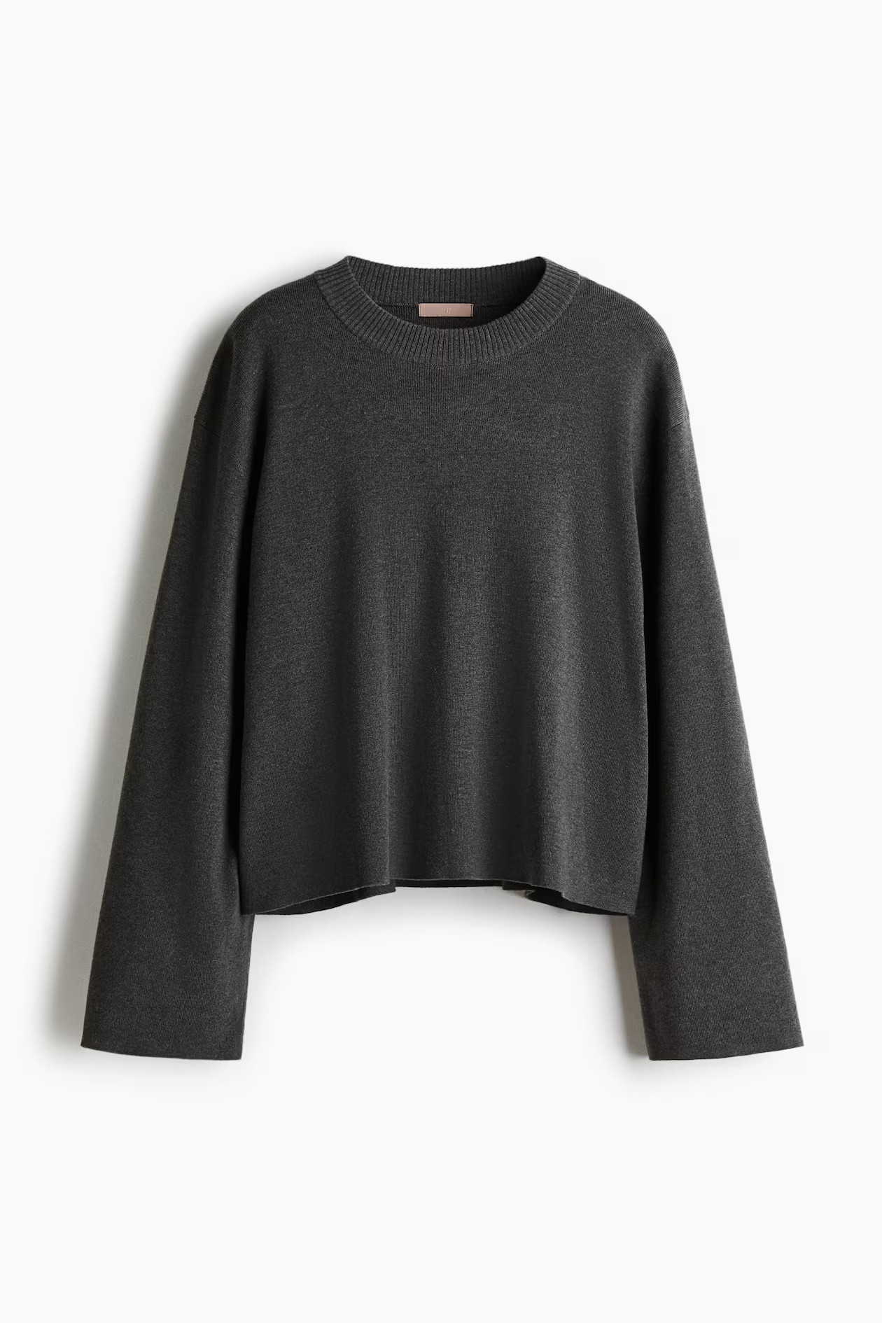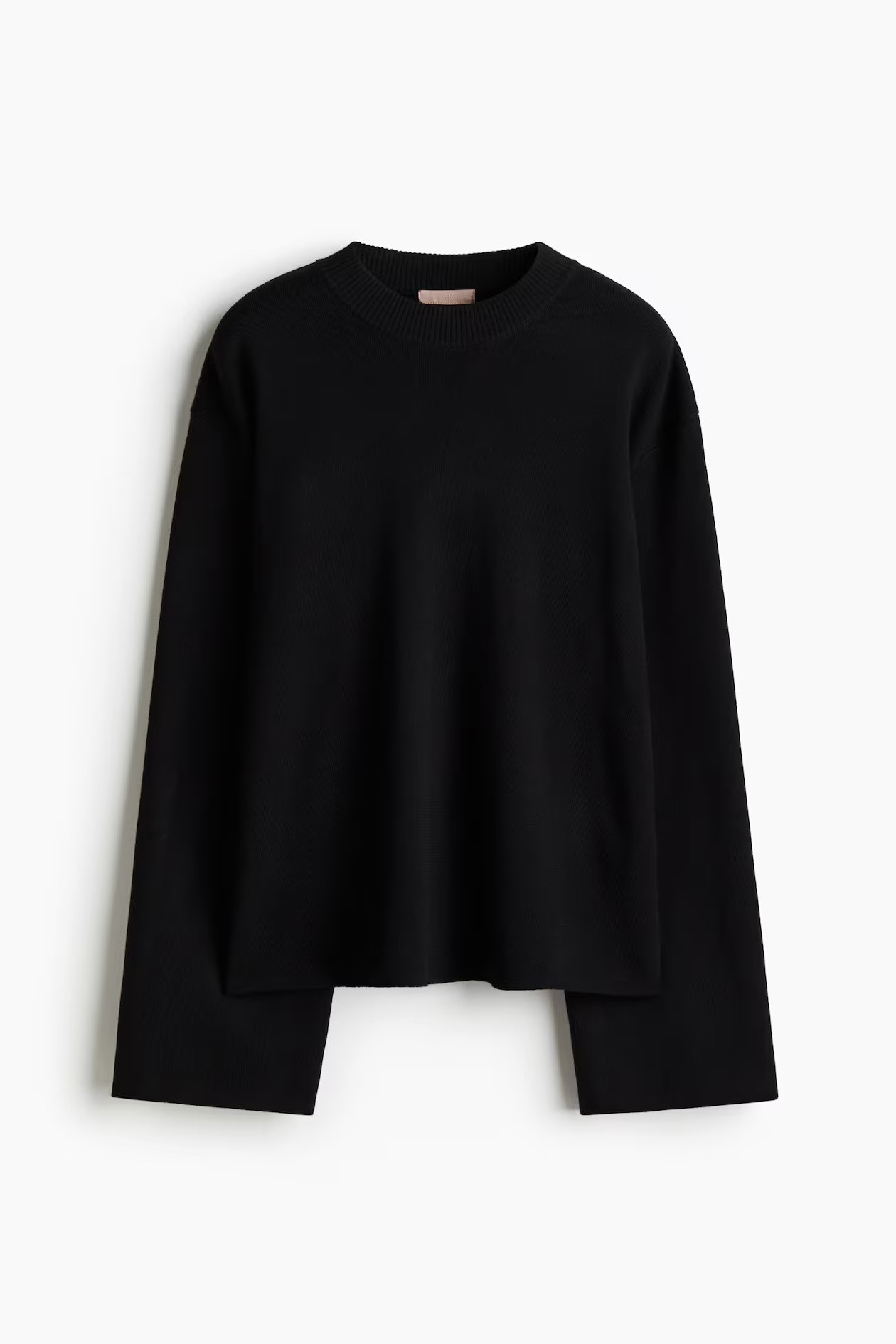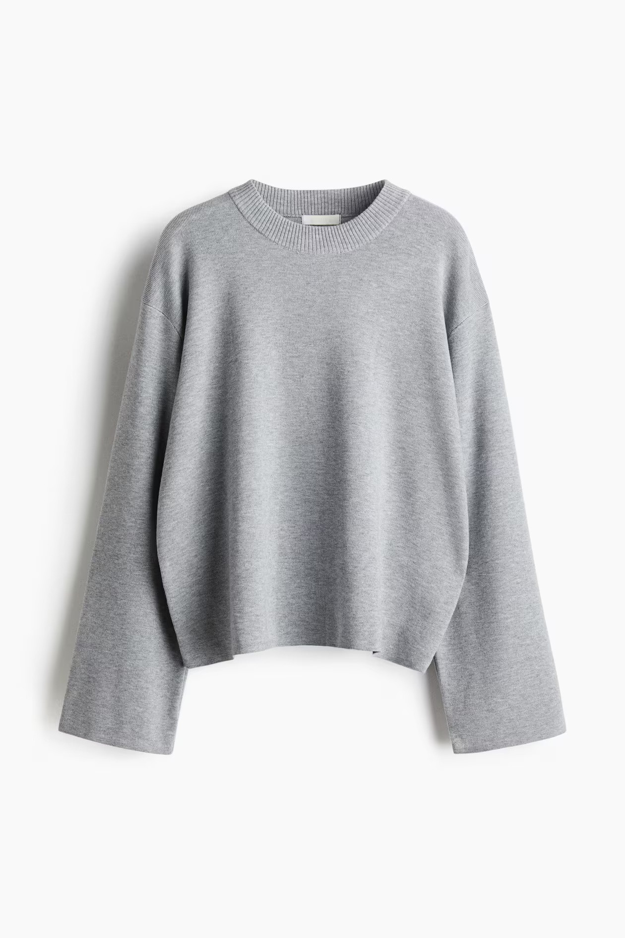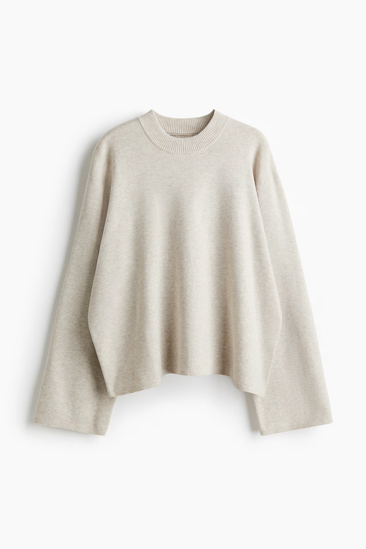 Oversized sweater made of soft fine knit with a ribbed round neck and long, slightly flared sleeves.