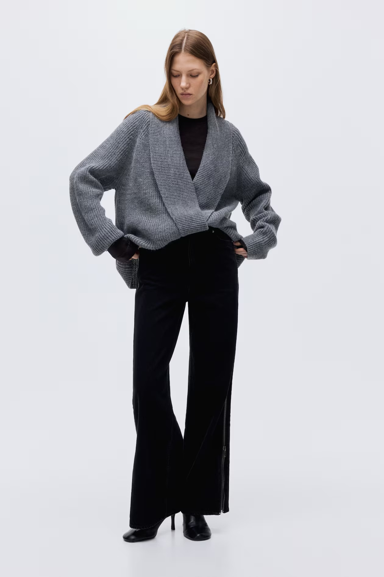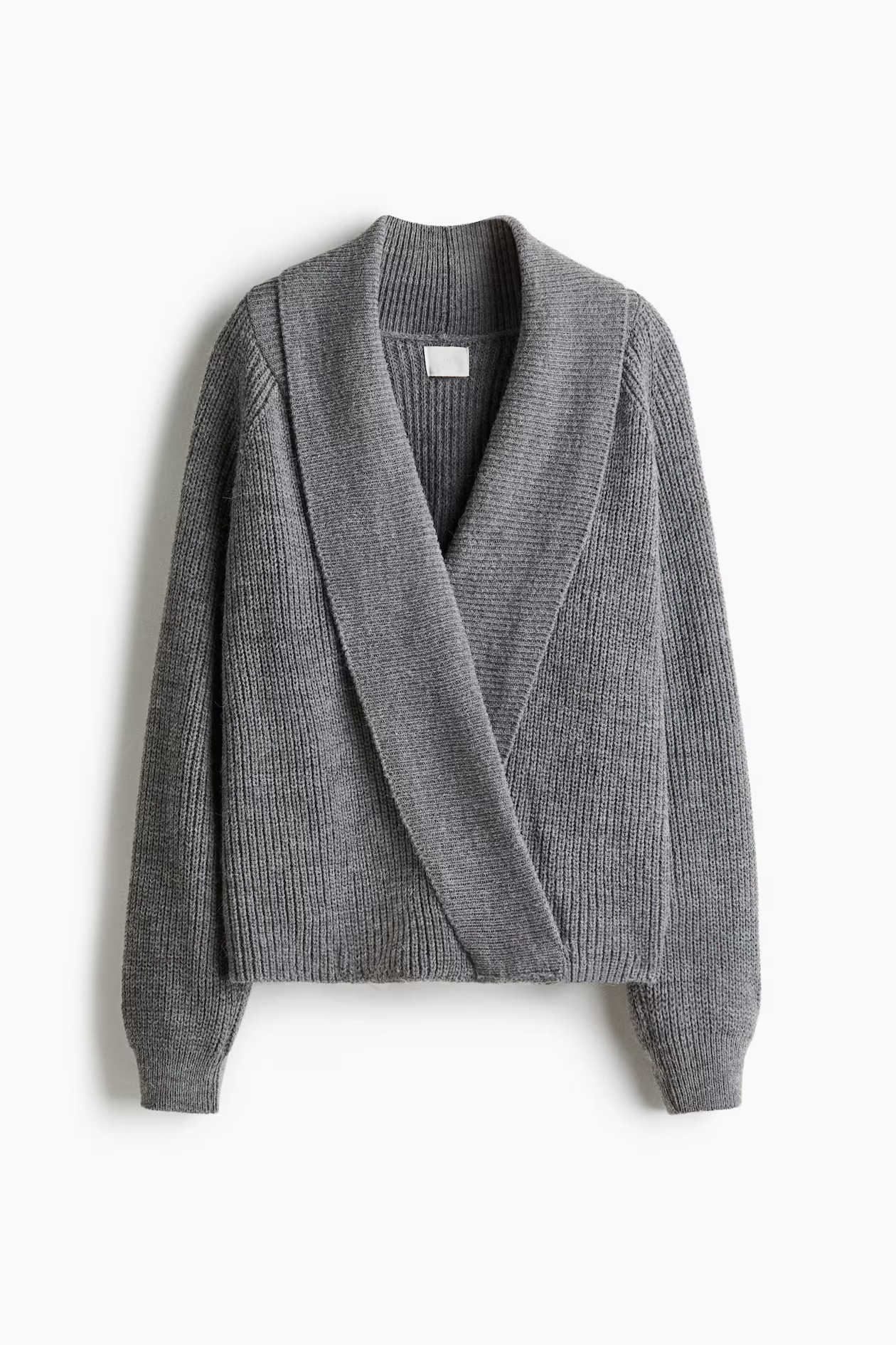 Oversized sweater in soft rib knit with an overlapping front and a deep V-neck. Long, tapered raglan sleeves.