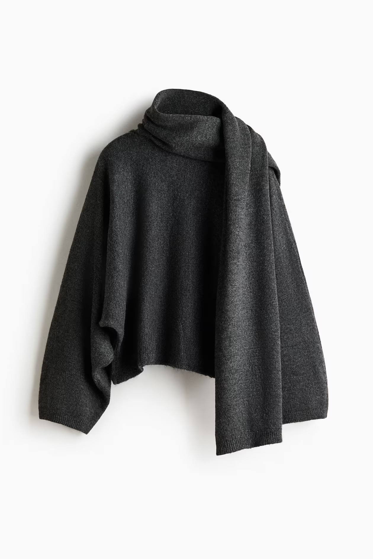 Oversized sweater in soft knit with a long scarf for versatile styling options. Long batwing sleeves and narrow ribbed cuffs and hem.