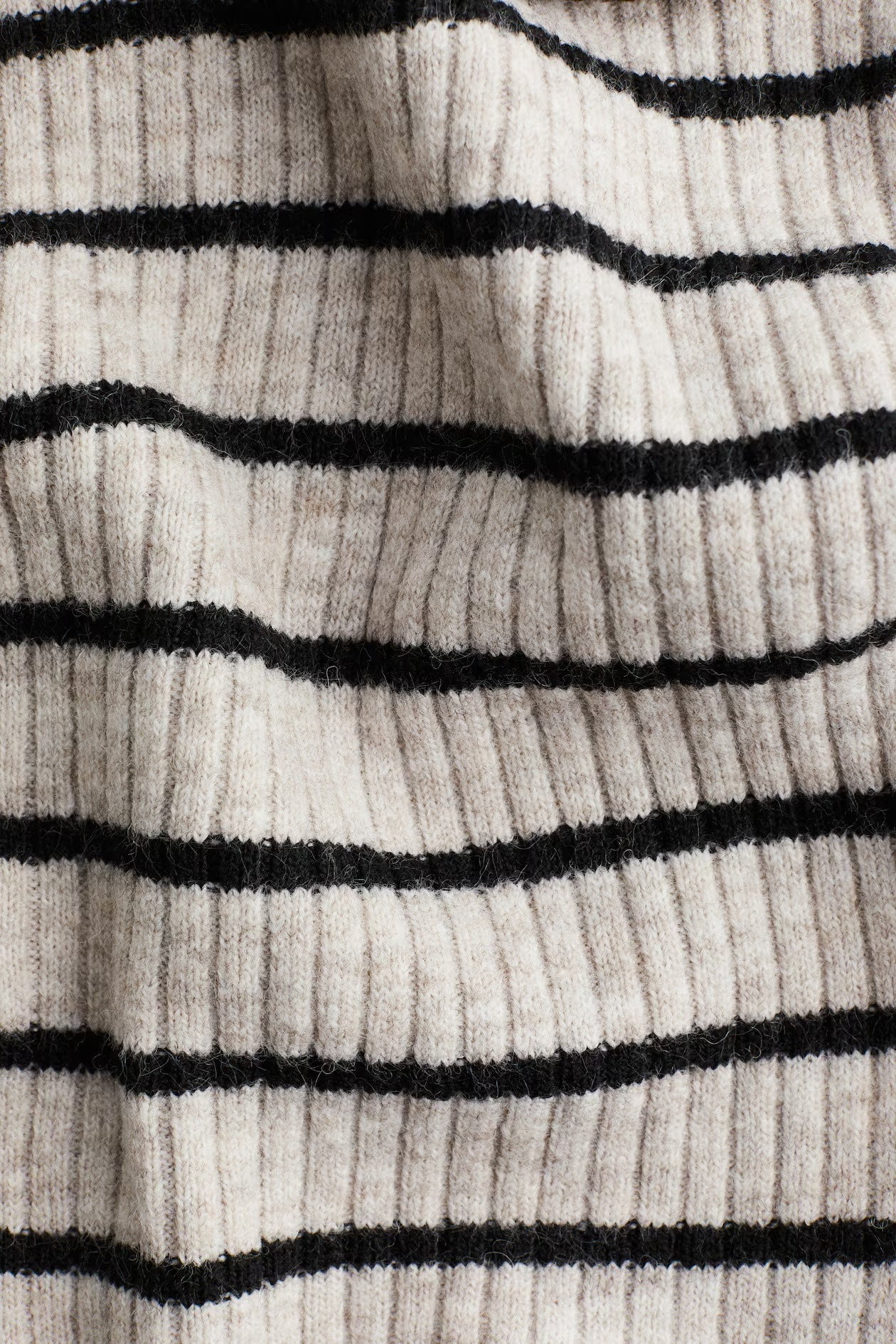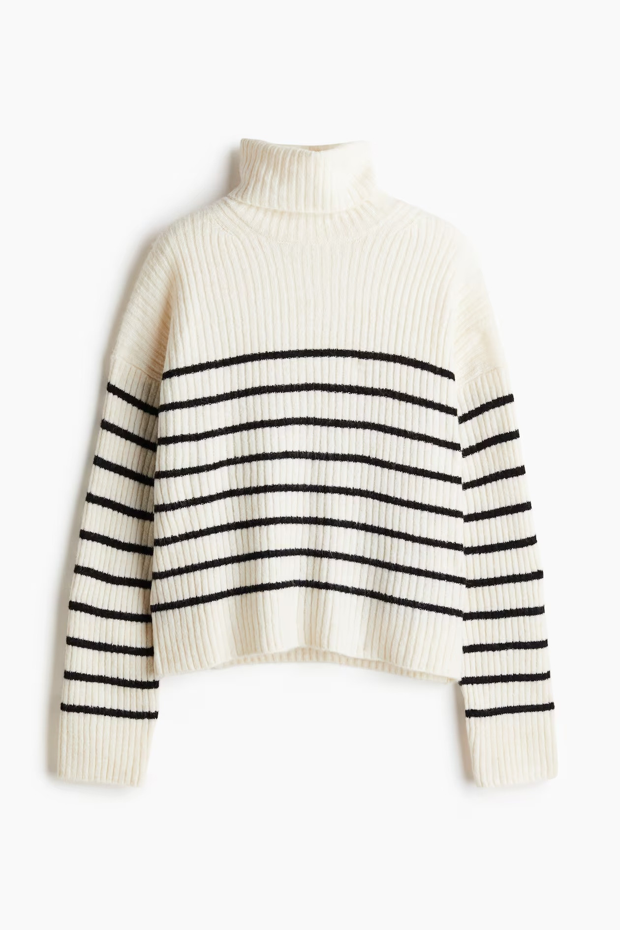 Oversized ribbed knit sweater with wool blend. Features a roll neck, dropped shoulders, and long sleeves.