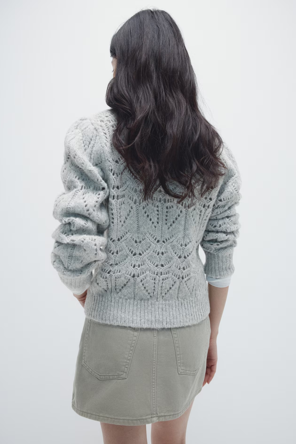 Figure-hugging sweater made of pointelle knit with wool. Featuring a scalloped round neck and ribbed cuffs and hem.