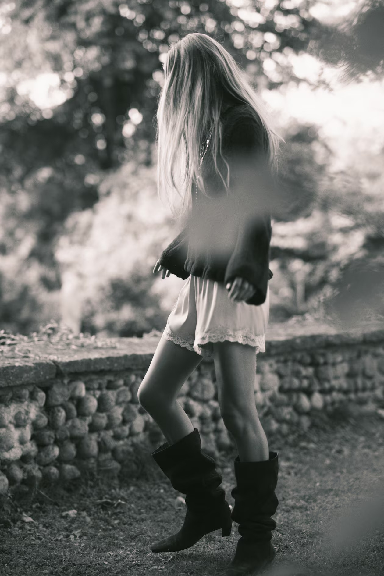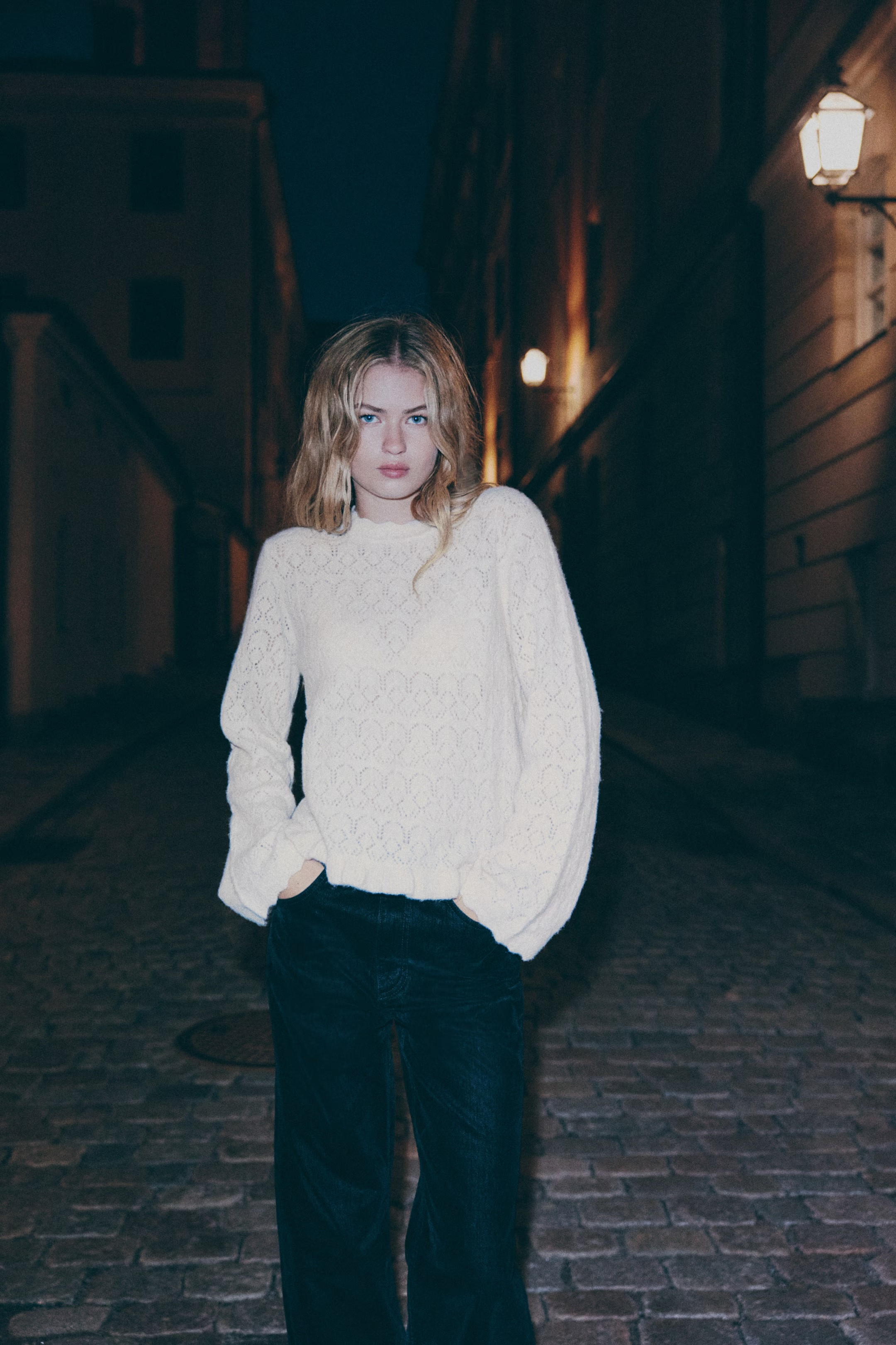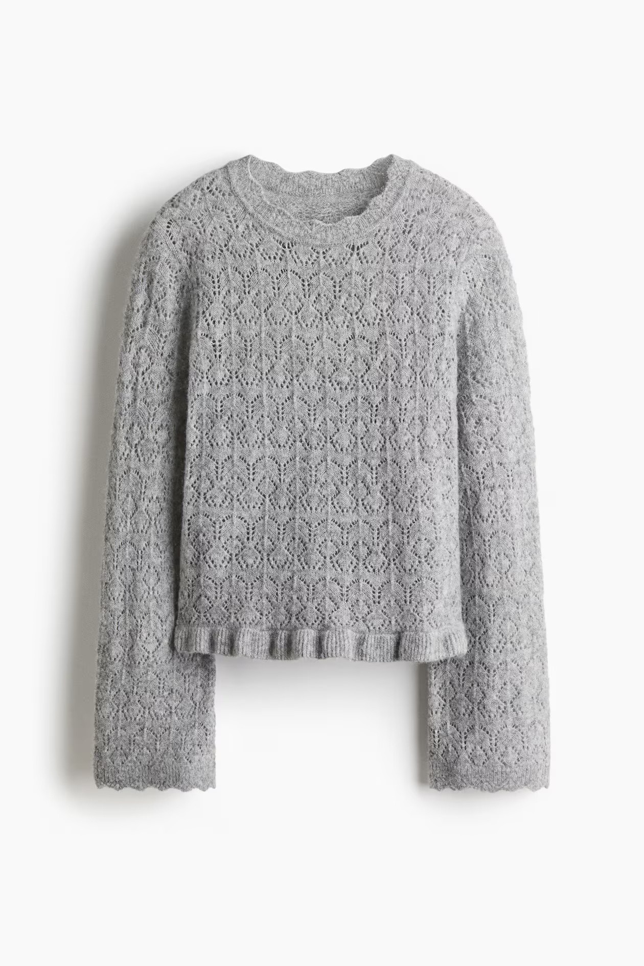 Short, figure-hugging sweater in soft pointelle knit with a scalloped round neckline. Long sleeves with scalloped cuffs and a ribbed flounce trim at the hem.