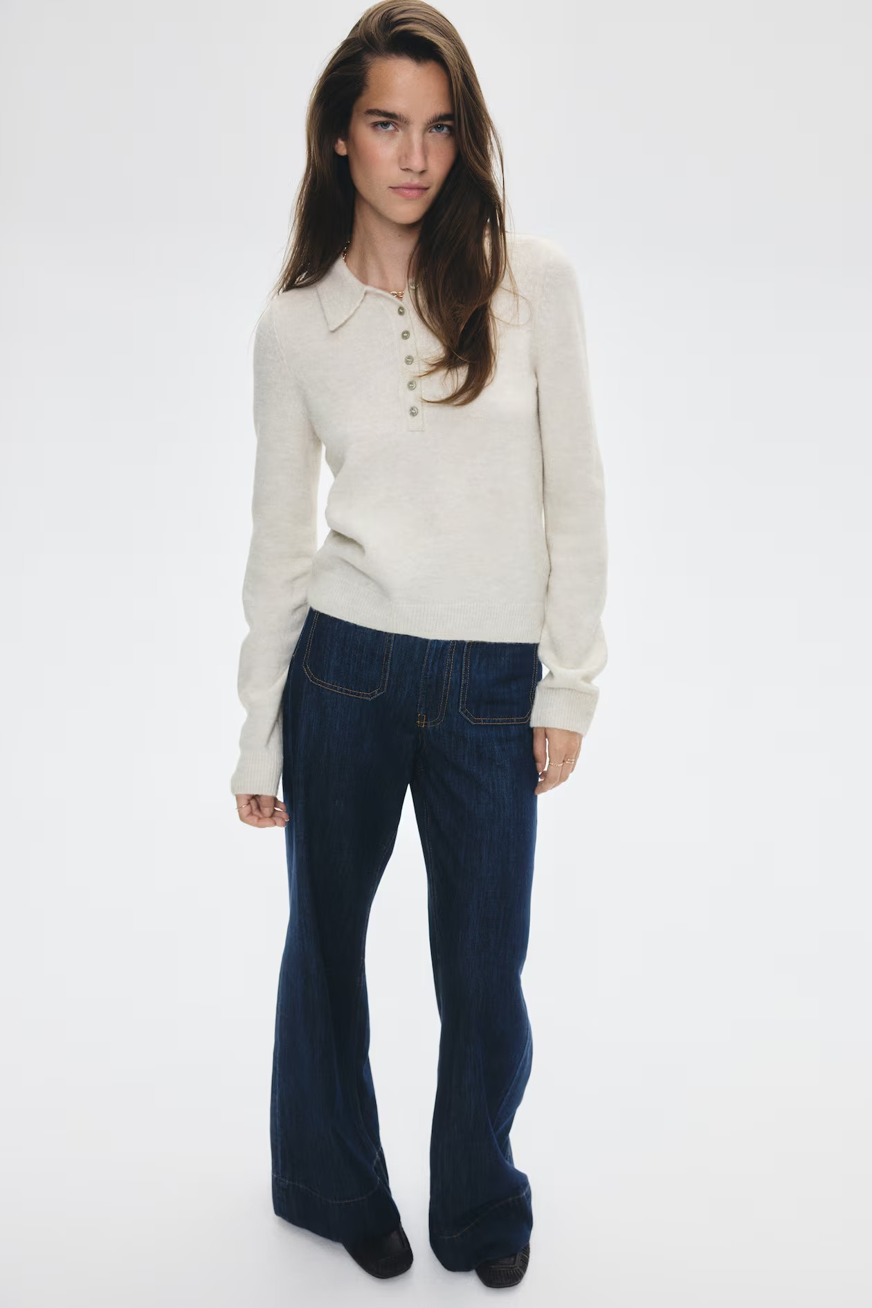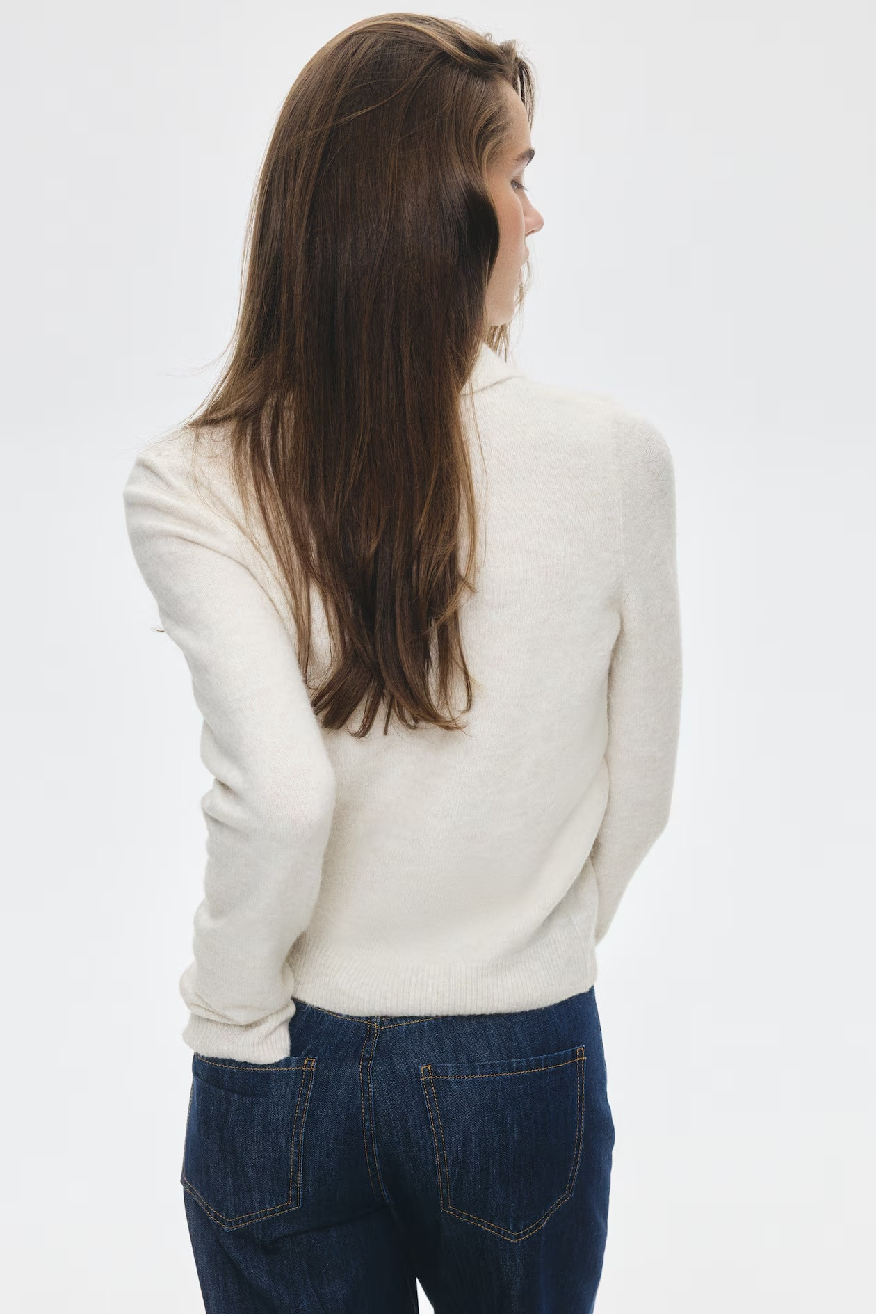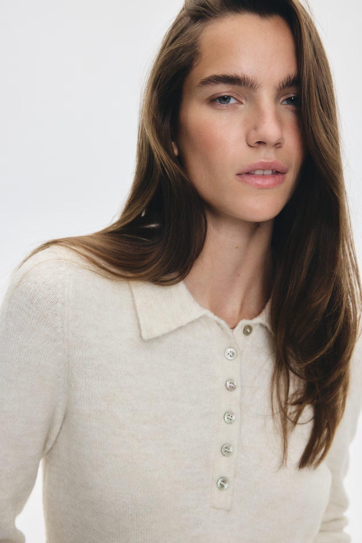 A figure-hugging sweater made of soft wool-blend knit. Featuring a collar, button placket, and ribbed cuffs and hem.