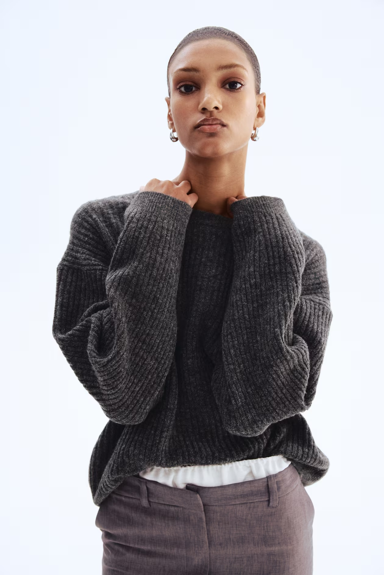 Casual sweater made of soft rib knit with a round neck, dropped shoulders and long, tapered sleeves.