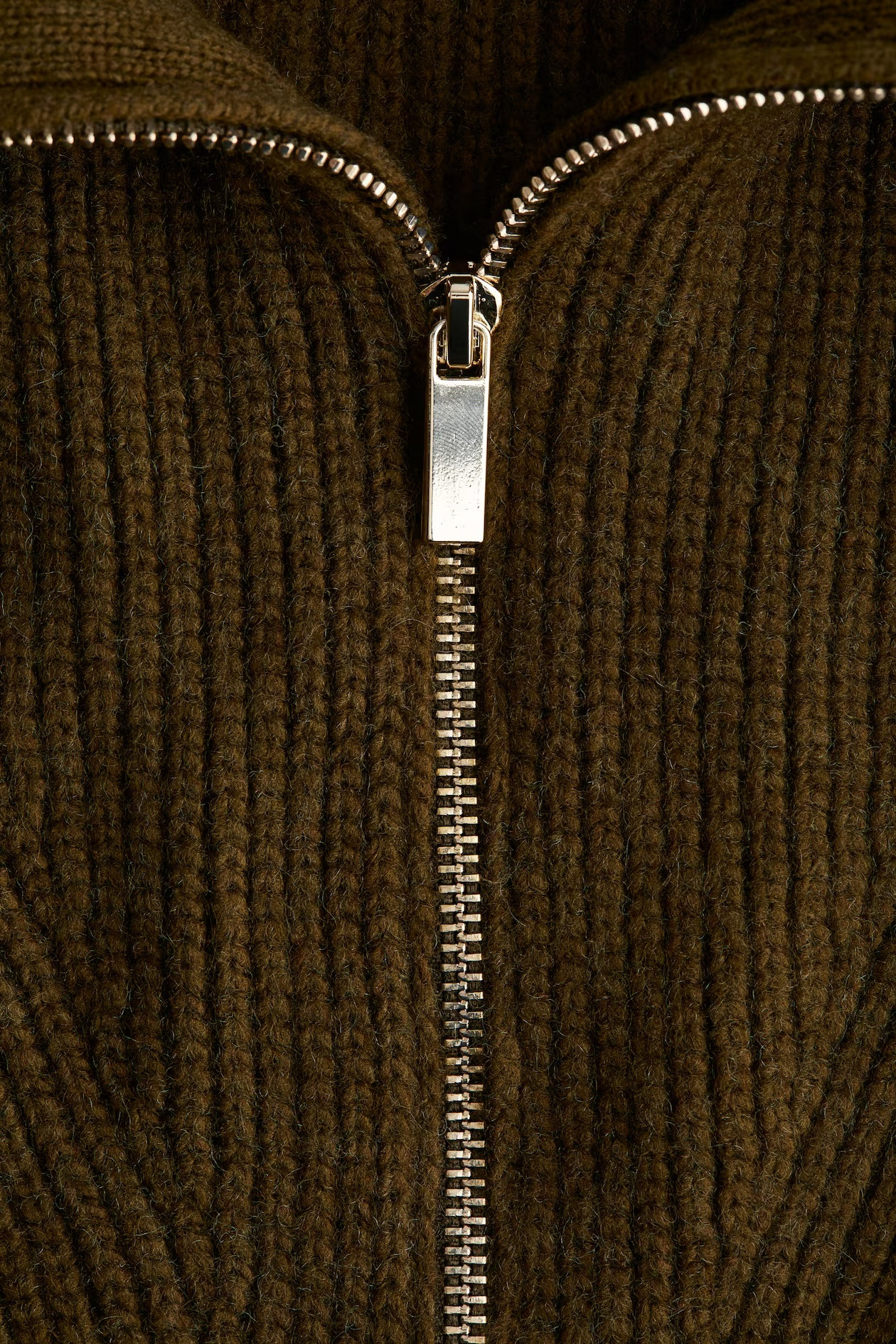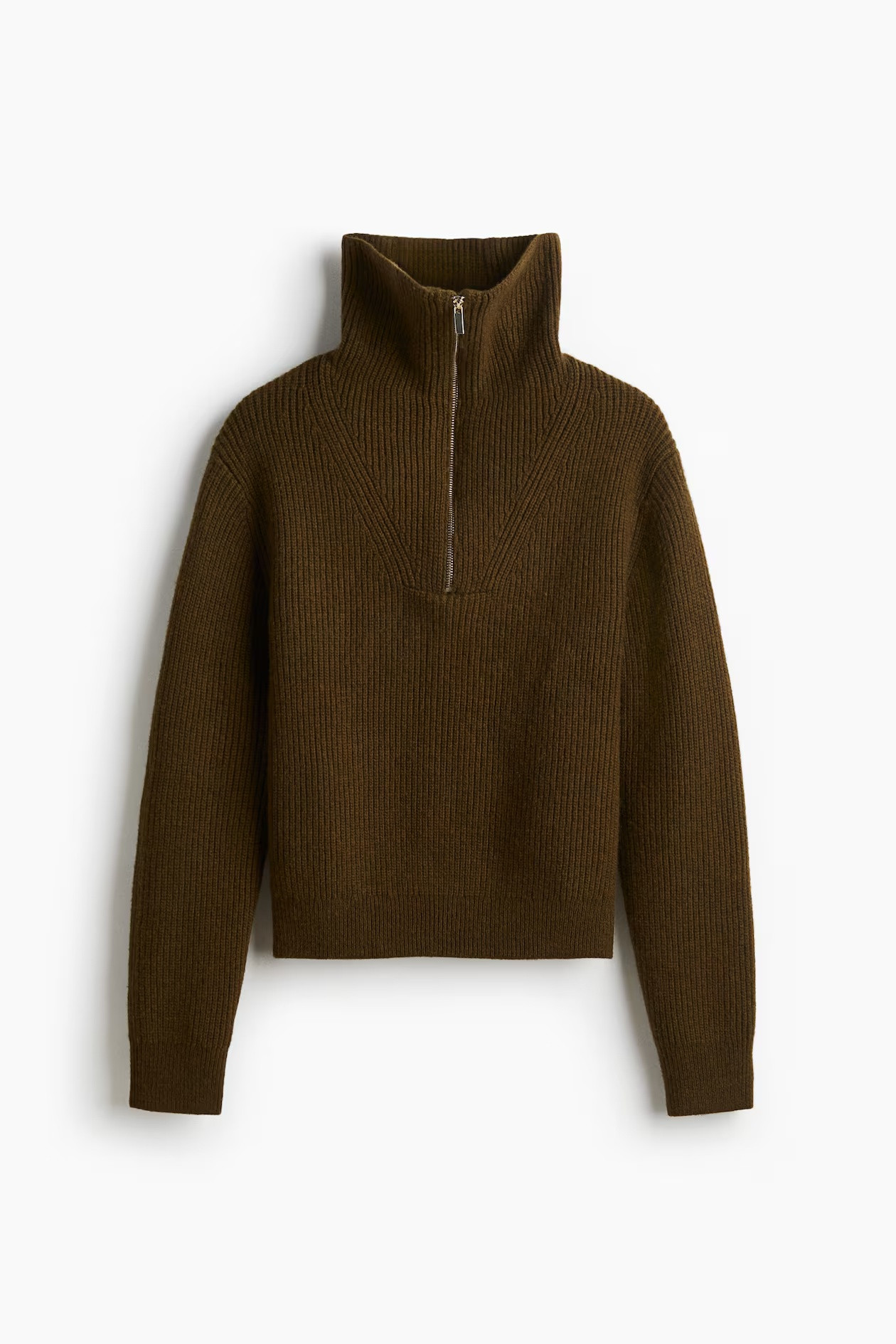 Soft knit sweater with a high stand-up collar and short zip closure. Dropped shoulders and ribbed cuffs and hem.