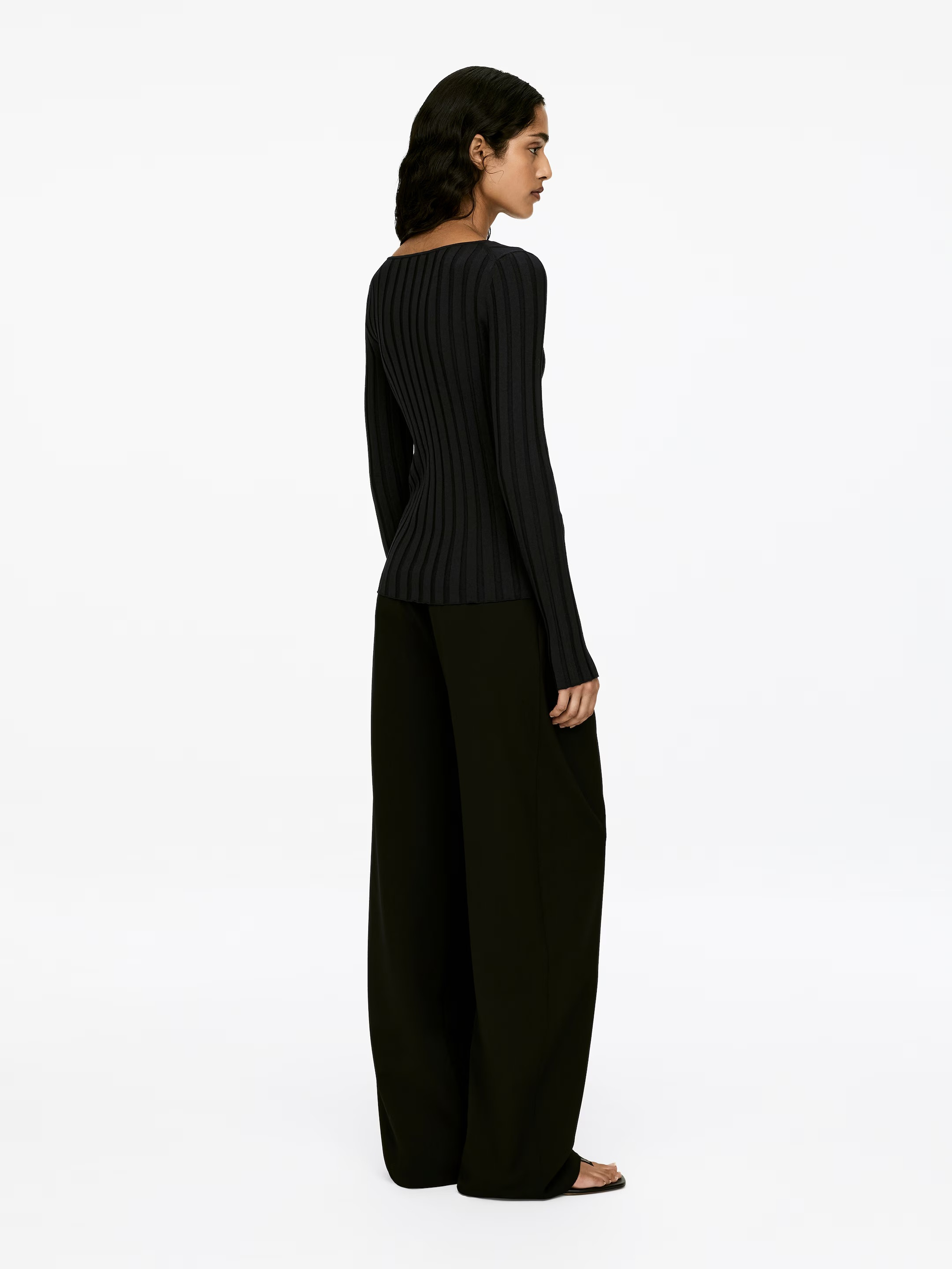 Long-sleeved ribbed knit sweater. Slim-fit style with a short zipper down the front.