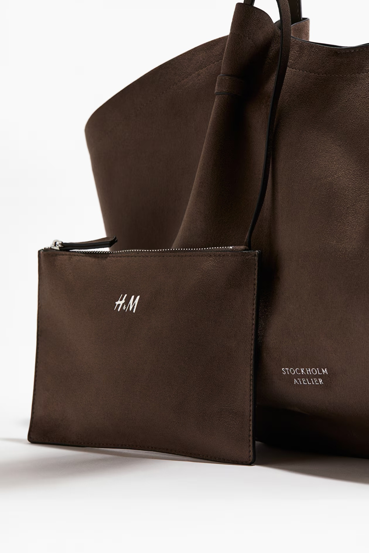 Slouchy shopper with a soft, napped finish. Handles at the top and a detachable, zipped pouch for safe storage of small valuables. Lined.