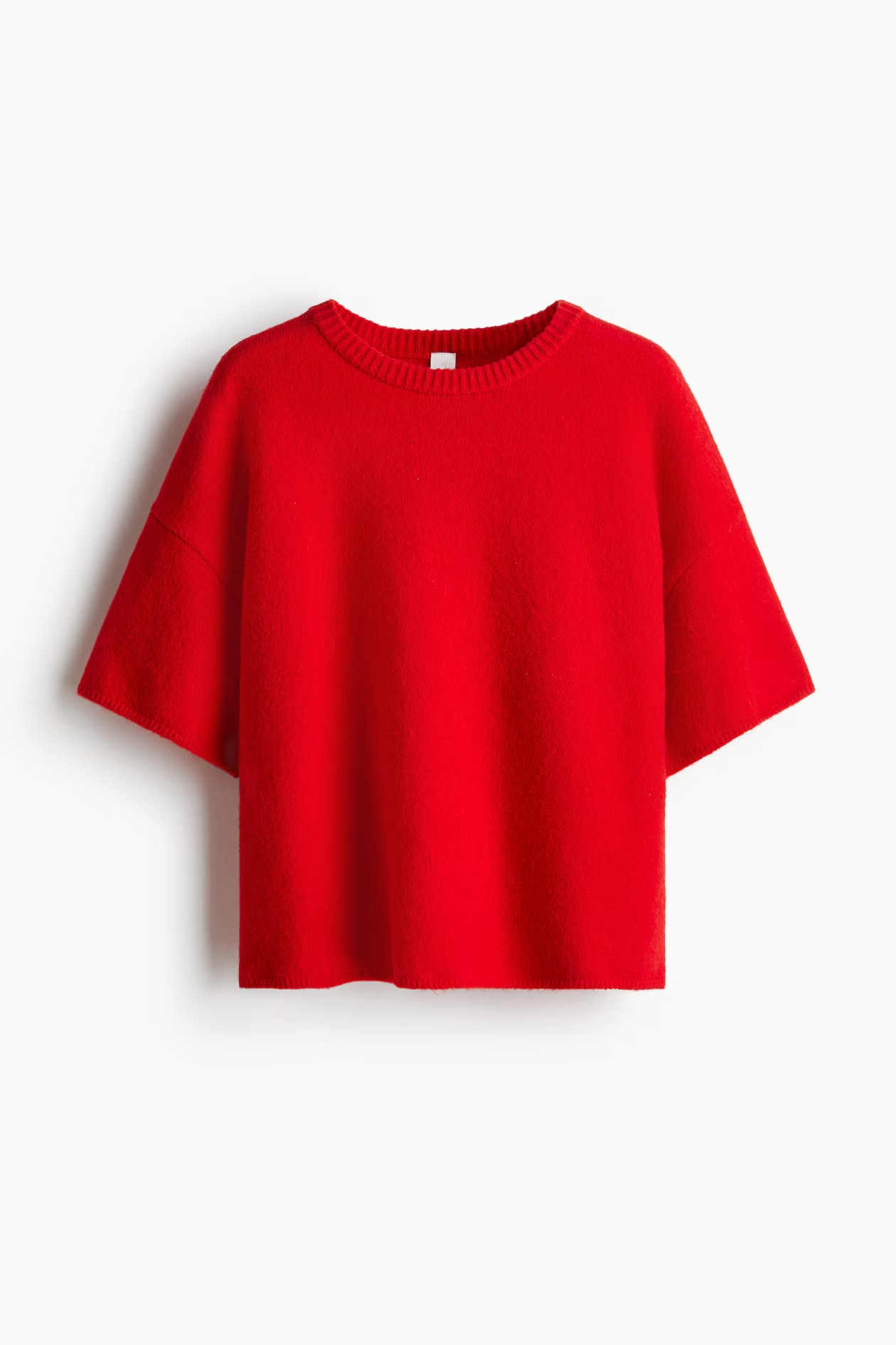 Loose-fitting short-sleeved sweater made of soft, slightly brushed knit. It features a round neck with a ribbed trim, dropped shoulders, and narrow ribbed cuffs and hem.