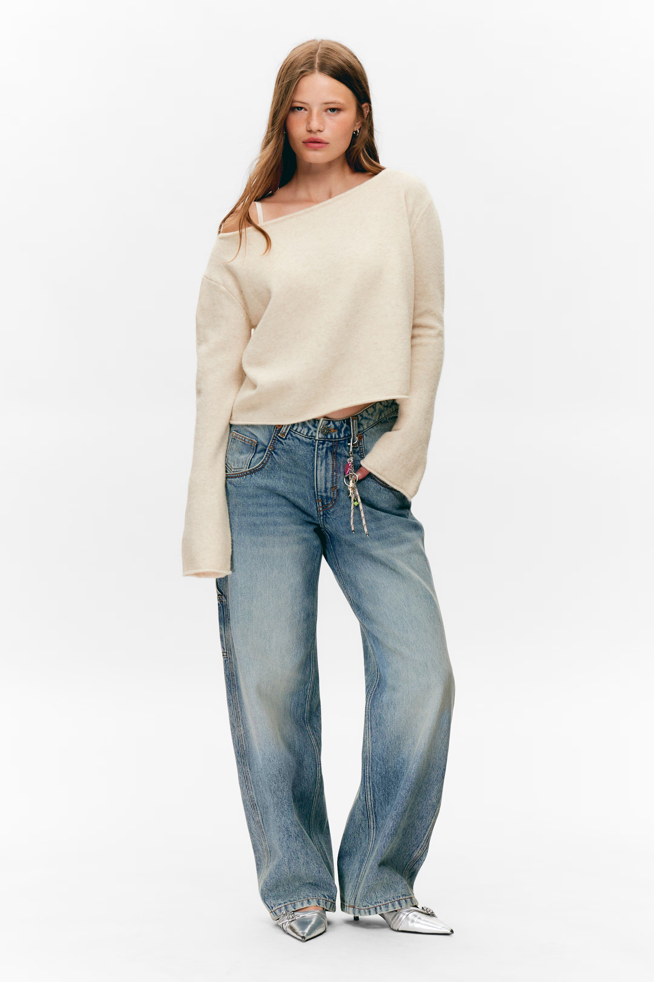 A relaxed-fit sweater with a folded ribbed detail at the neckline. Features rolled edges on the sleeves and hem. Made from recycled polyester.