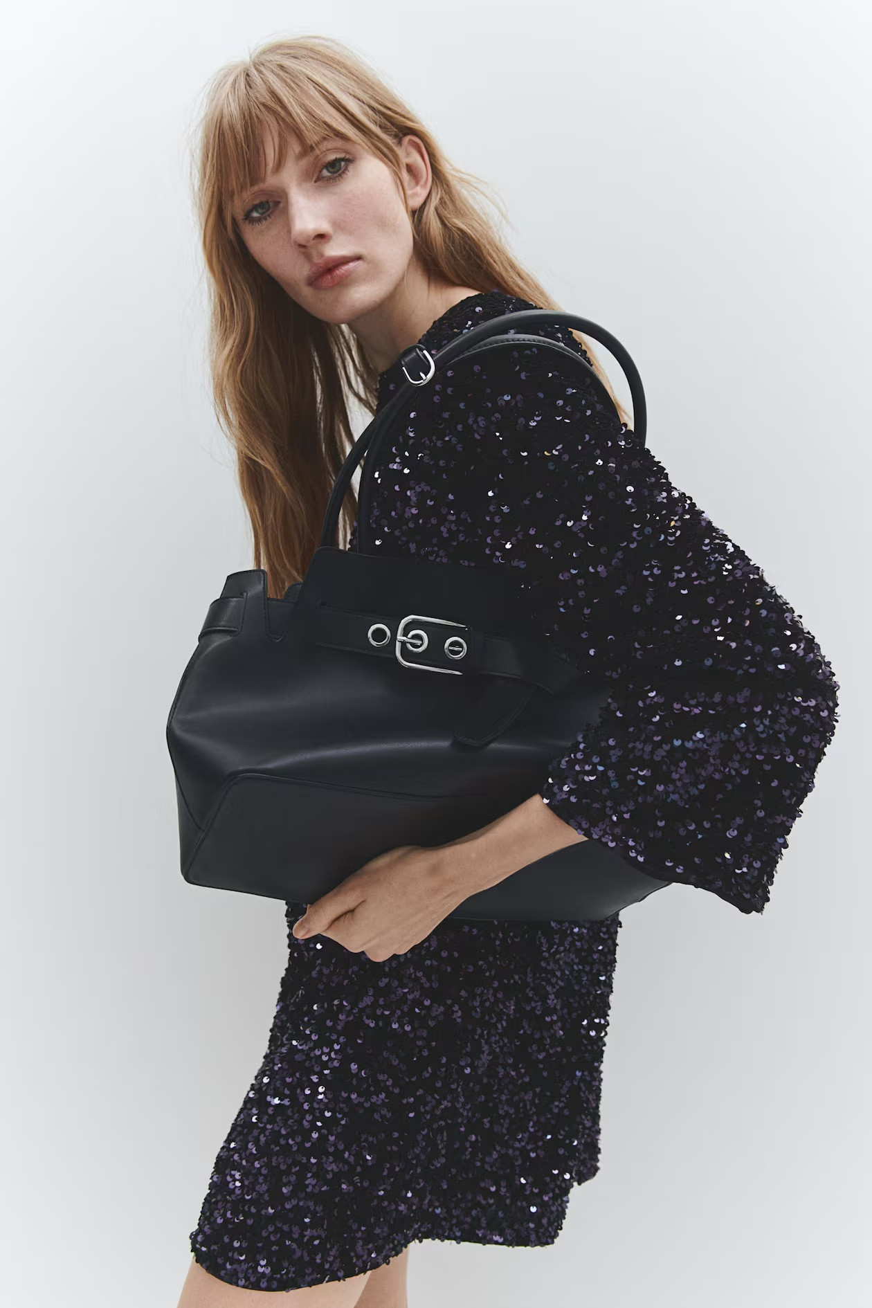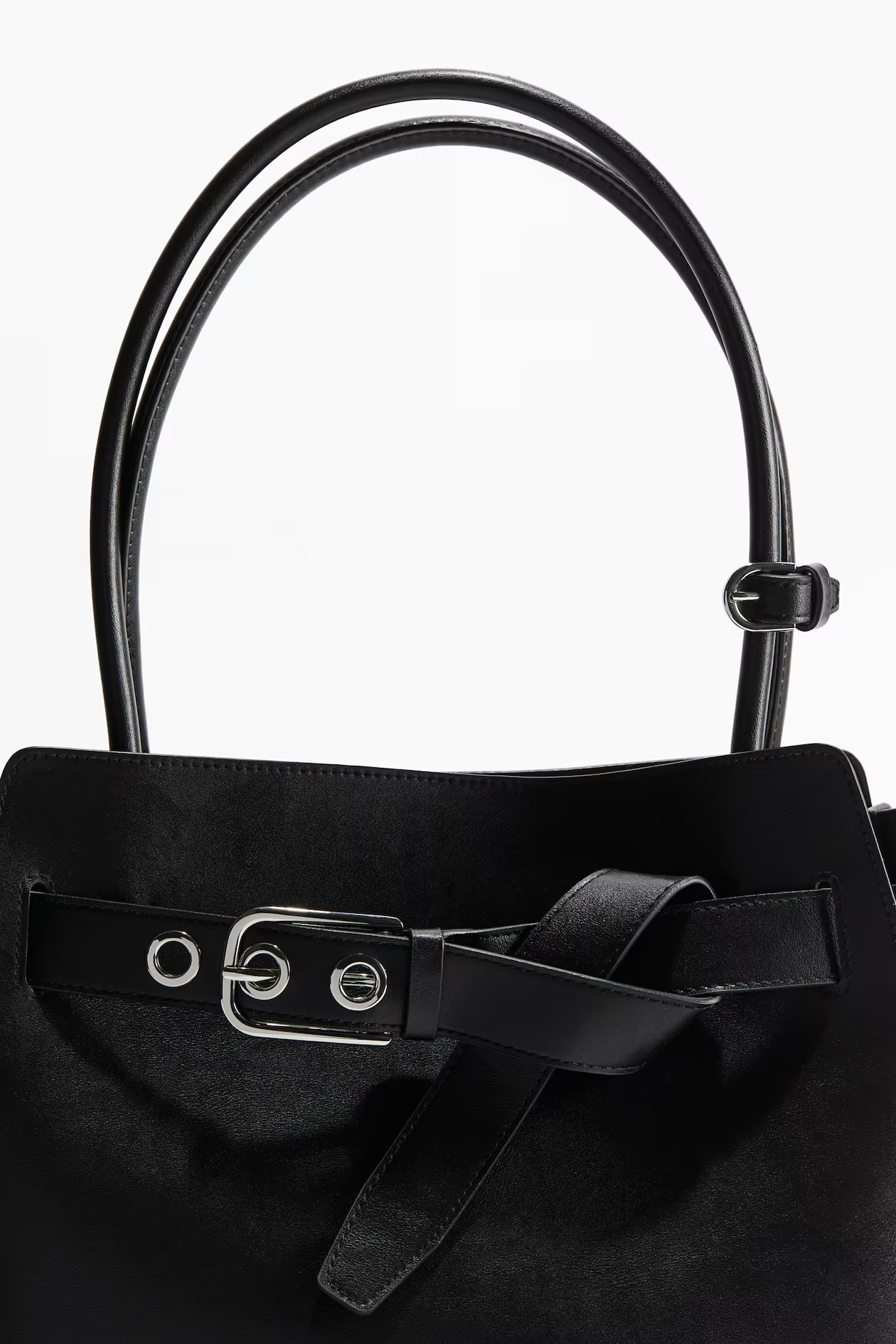 Tote bag in coated fabric featuring tubular handles that can be fastened together with a tab and metal buckle. Long strap around the top with eyelets and a metal buckle. Lined. Depth 15 cm. Height 25 cm. Width 35 cm.