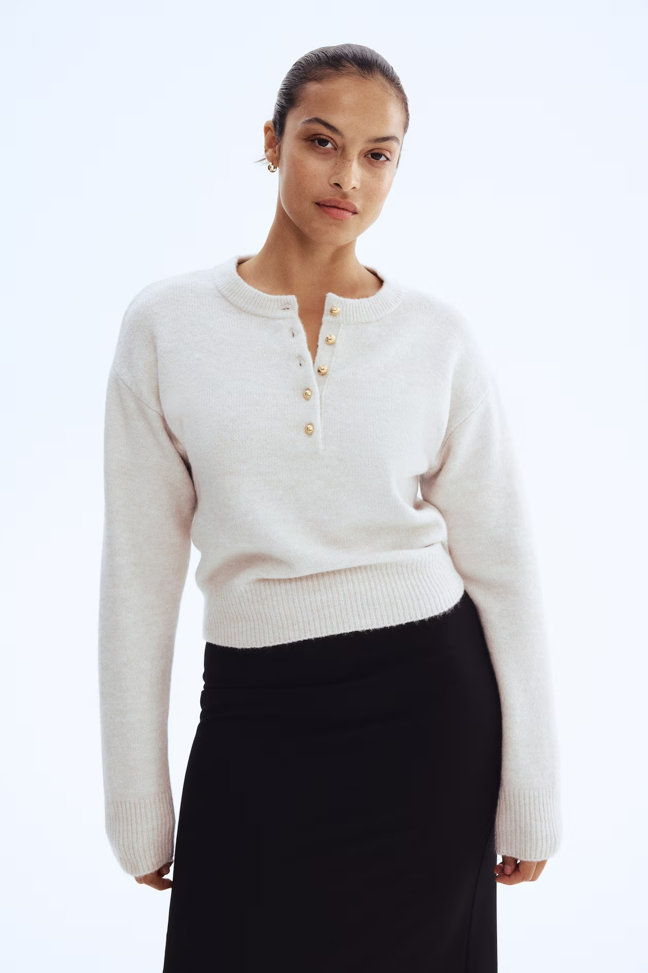 Soft knit sweater with a ribbed round neck and buttons at the front. Dropped shoulders and ribbed cuffs and hem.
