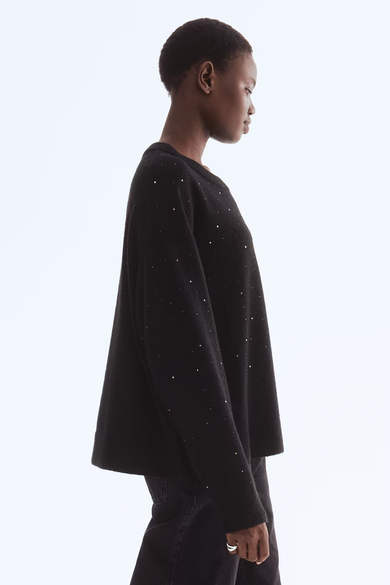 Oversized sweater in soft knit with embellishments. It features a round neck with a ribbed trim, dropped shoulders, and ribbed cuffs and hem.