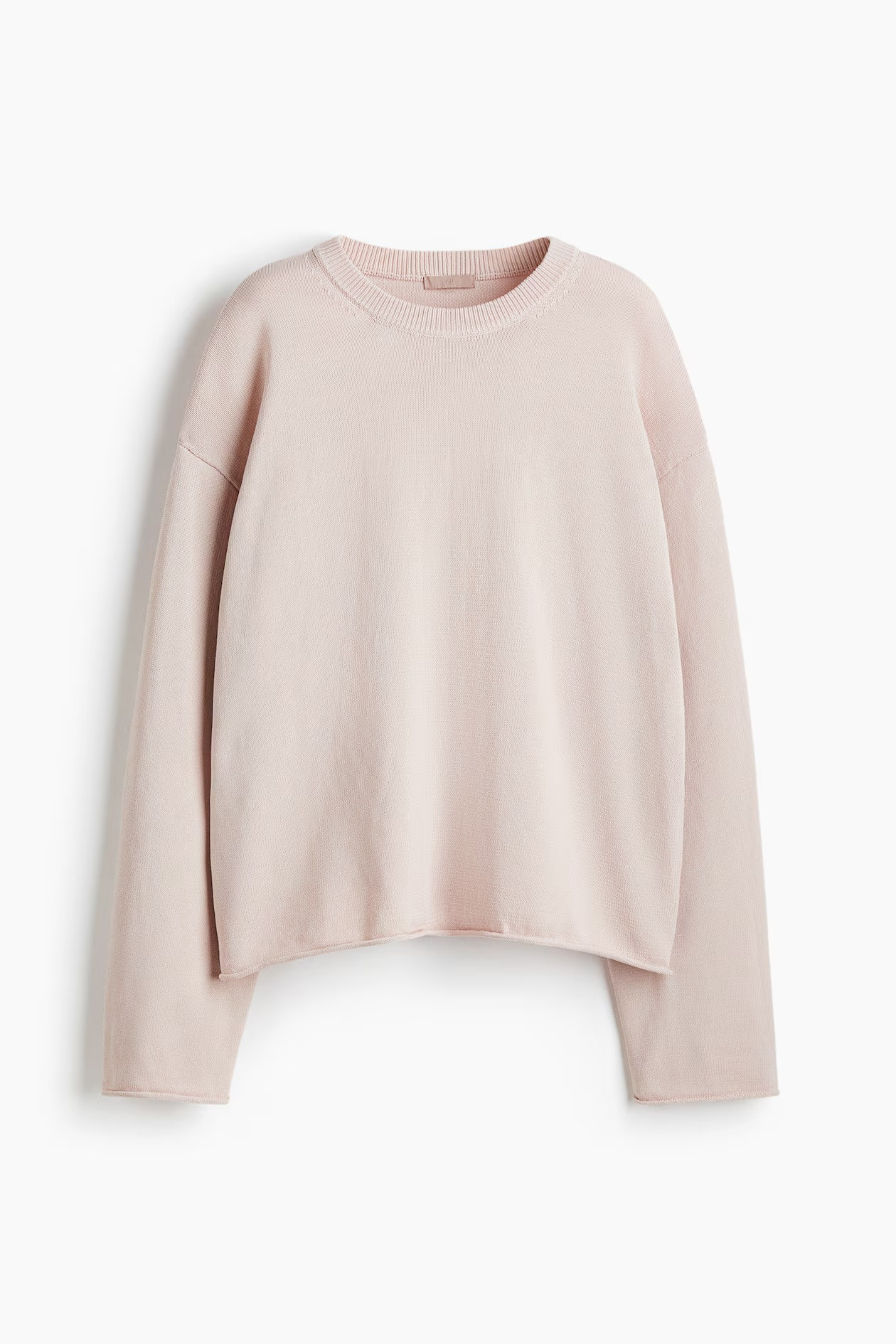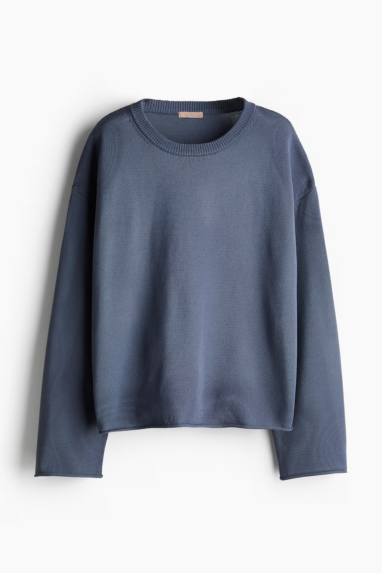 Long-sleeved sweater made of soft knit with a ribbed round neck and dropped shoulders. Loose fit. Rolled cuffs and hem.