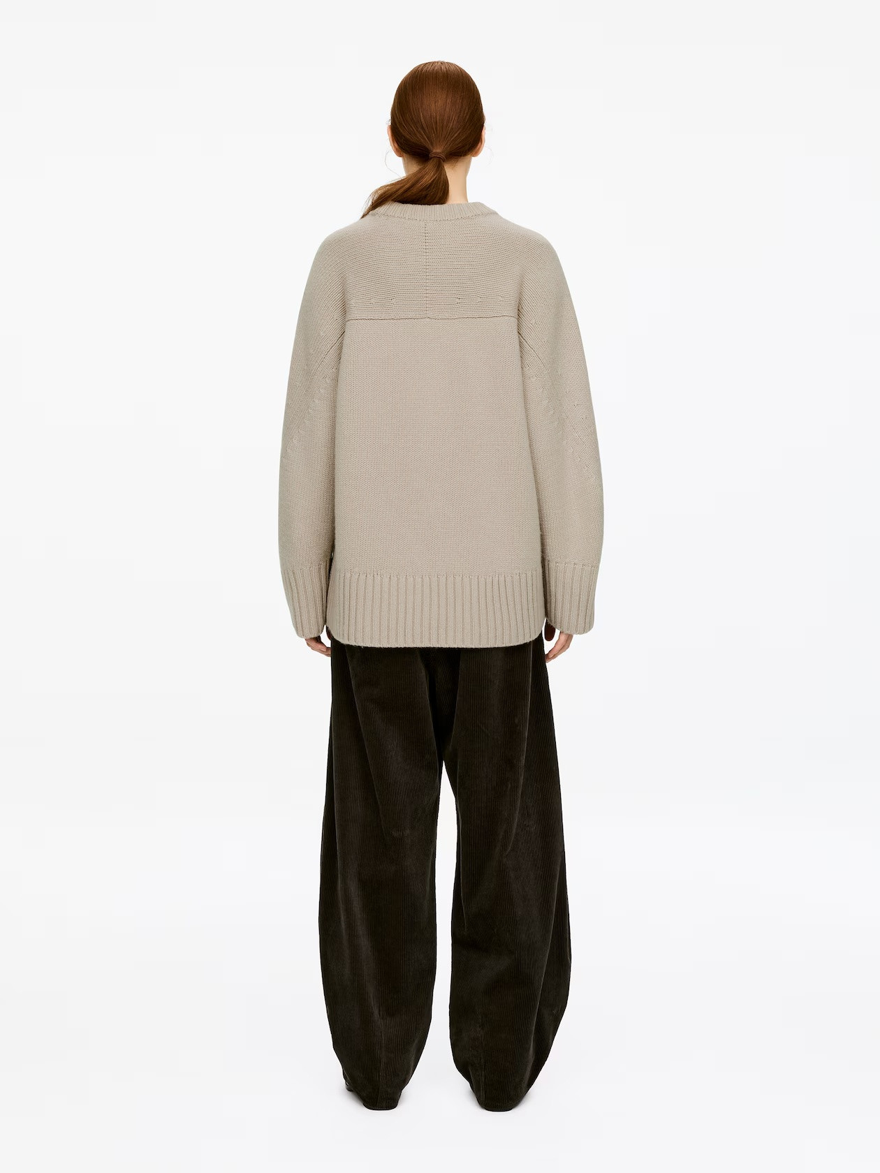 A crew neck sweater in pure cashmere. A chunky knit style with an oversized, cocoon-like silhouette and twisted sleeves. This style is made from 100% GCS-certified cashmere. The Good Cashmere Standard (GCS), established by the Aid by Trade Foundation (AbTF), sets criteria regarding animal welfare, land management, and the working conditions of the shepherds. The percentage refers to the main material, not the yarn.