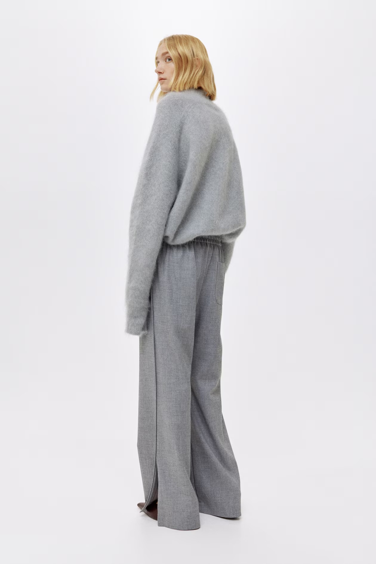 Oversized sweater made of soft mohair and wool knit. Ribbed turtleneck, long saddle sleeves, and ribbed cuffs and hem.