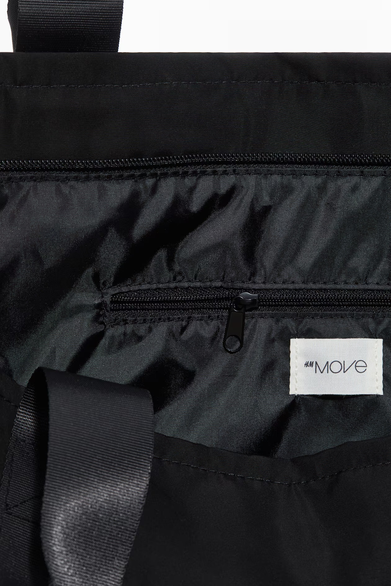 Spacious sports bag in water-repellent functional fabric with two handles, a zip at the top and zipped outer and inner compartments. Lined. Depth 13 cm. Height 41.5 cm. Width at the bottom 43 cm. Capacity 24 litres.