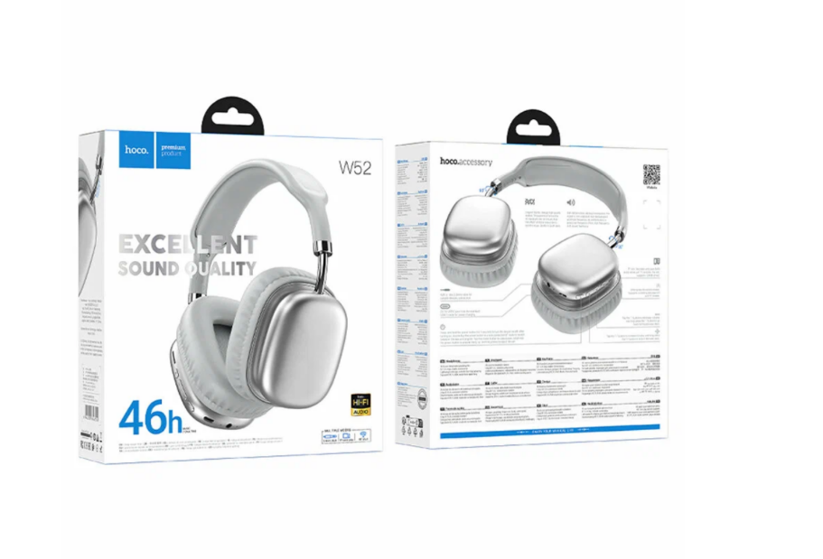 The HOCO W52 is a versatile wireless headphone that combines style, sound quality, and versatility. They work for up to 46 hours, support playback via Bluetooth, AUX cable and TF cards, and are equipped with convenient voice prompts.