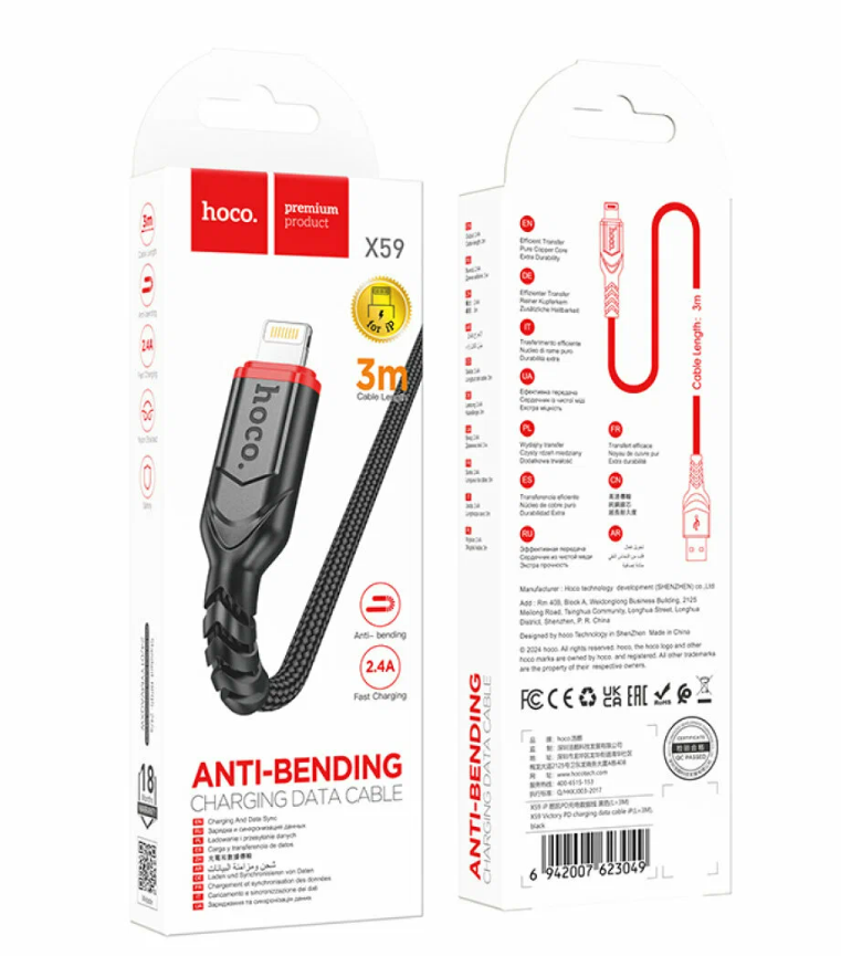 Length: 3 meters.he Lightning hoco X59 USB data cable is a high-quality and reliable cable 3 meters long, weighing 85 grams, designed to connect devices with a Lightning connector to a computer, charge, or other power source.