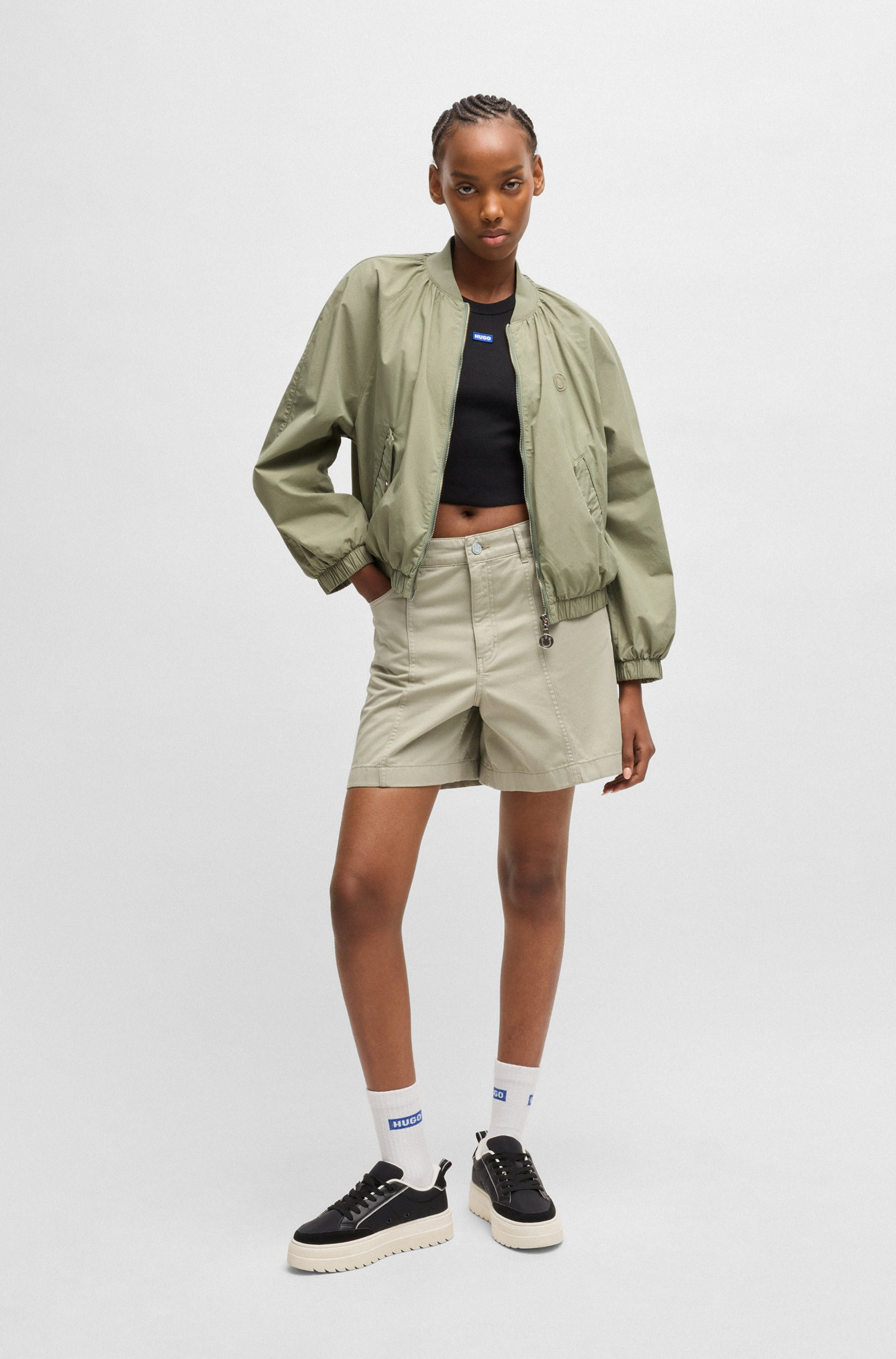 With a bomber collar and patch pockets, this HUGO Womenswear jacket is handy in the summer. Elasticated waist and embroidered Happy HUGO logo.