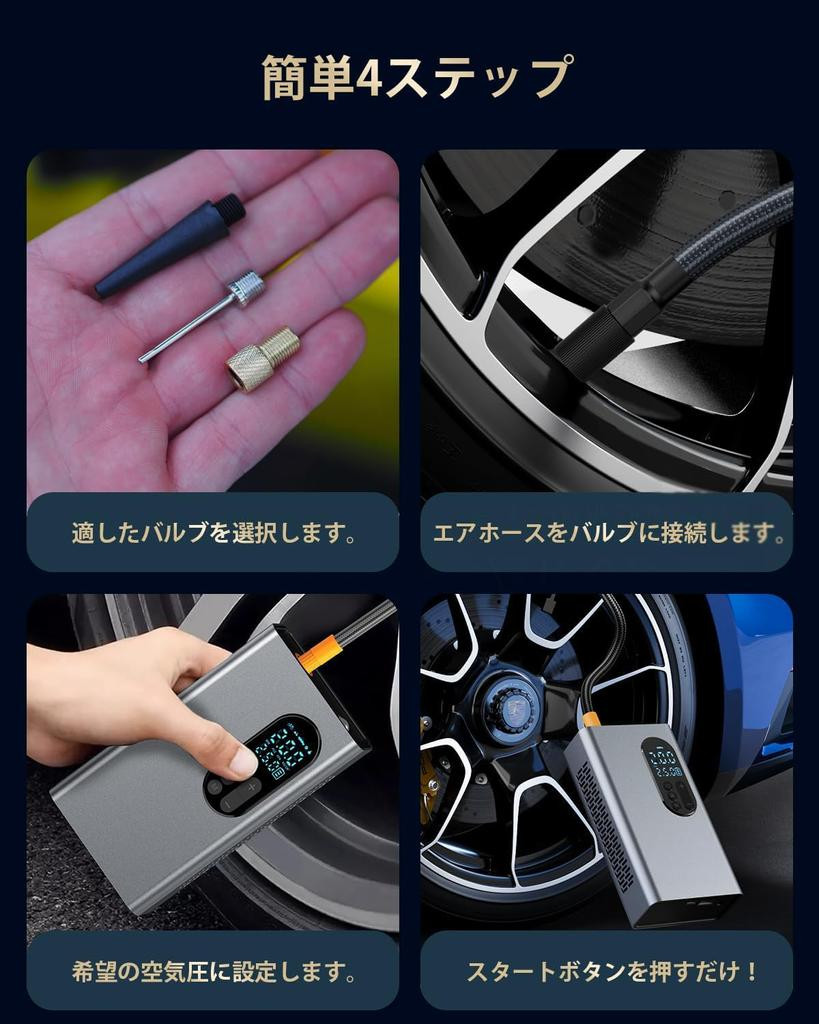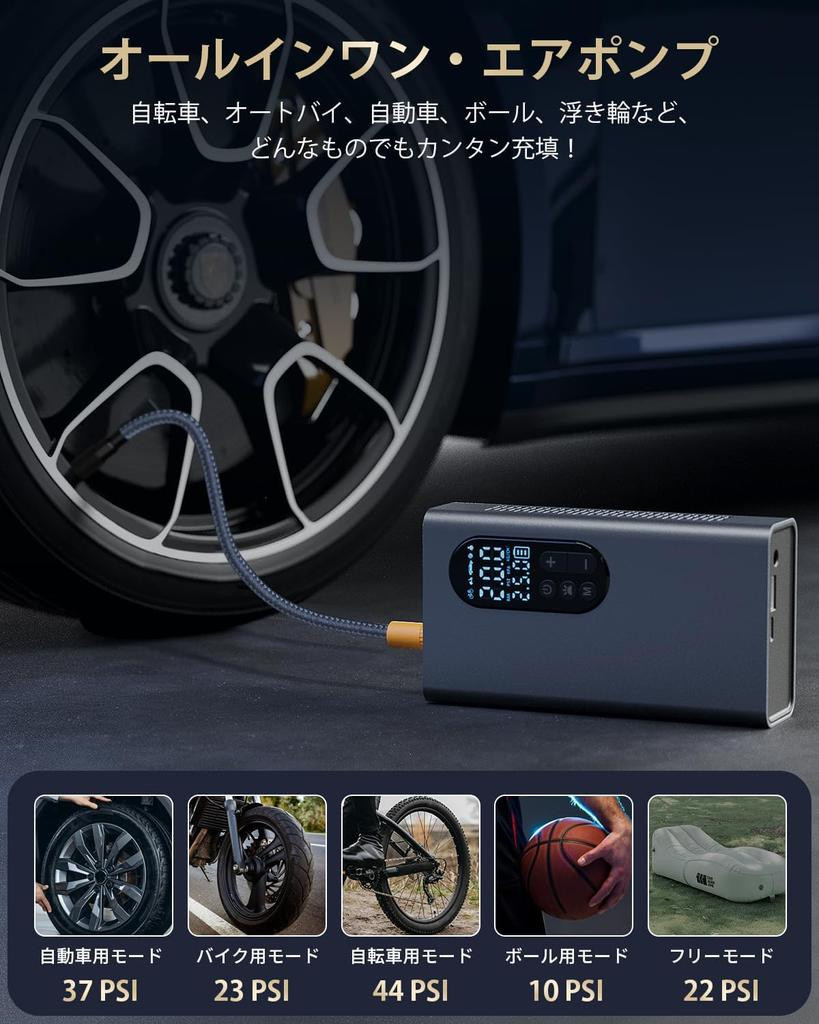 [Large Capacity & Powerful] With a large capacity of 6000mAh, the cordless air pump can fill 12 car tires with one charge. It also has a USB output terminal, so you can charge devices such as mobile phones and small electric devices. Equipped with 3 patterns of LED lights: white lighting, emergency SOS, and flash, allowing you to work efficiently at night. [Equipped with 5 intelligence modes & rapid heat dissipation] Can be used not only for all types of cars, motorcycles, and bicycles, but also for all balls and air toys. The air pressure can be set up to 150psi (10.3bar), which not only accommodates various car tires, but also greatly improves efficiency. There are heat exhaust holes on both the left and right sides of the compact air pump body, so you can use it with confidence as it will not get hot even when used for a long time. [Large LCD display & supports 4 types of units] Press the switch button to select the pressure unit from 4 types: "PSI", "BAR", "KPA", and "kg/cm²". Information such as the unit of air pressure, inflation mode, remaining amount, set air pressure, and real-time values of air pressure are displayed on the LCD display. For detailed usage, please refer to the Japanese instruction manual for this air inlet. [Equipped with automatic OFF function & filling completed in 10 seconds] Equipped with a detection sensor and automatic OFF function, if you set the air pressure in advance, it will automatically stop when the specified air pressure is reached. As a turbo compressor that rotates at 19,000 revolutions per minute, it is eight times more efficient than conventional electric air pumps, and can fill one ball in 10 seconds. [With air gauge & small and lightweight] Equipped with an air gauge, you can check the air pressure of your car before riding to see if there are any abnormalities. The importance of constant tire pressure: It can effectively reduce tire wear, reduce fuel consumption and ensure driving safety. The small and lightweight design makes it easy for even women to use. Precautions 1. During the use of the product, the equipment may generate heat, which may lead to atomization of the cylinder lubricating oil, and a small amount of smoke and strange odor may occur. If you find this, please stop it immediately, Let it cool for about 30 minutes before using. 2.Charging specifications are compatible with 5V2A chargers, so if it is less than 5V2A, it will take about 3 times longer to fully charge, which will take approximately 8 hours or more. 3. For everyday use, we recommend keeping the volume at a moderate level (75 decibels or less), but please do not use it at night or early in the morning to avoid disturbing those around you. 4. When installing or removing the air valve, there will be some air leakage situation, so please fix the air valve firmly before inflating it. 5. Equipment may generate heat when inflating. To properly use your air compressor, use it for no more than 10 minutes at a time, then turn it off and let it cool for 15 minutes before using it again. 6. When inflating, do not block the air inlet. 7.Do not place this product in a place where the temperature is too high or too low. 8. Choose the appropriate nozzle for your valve. (If the switching valve is If it is not properly installed, the air pump will not operate. )