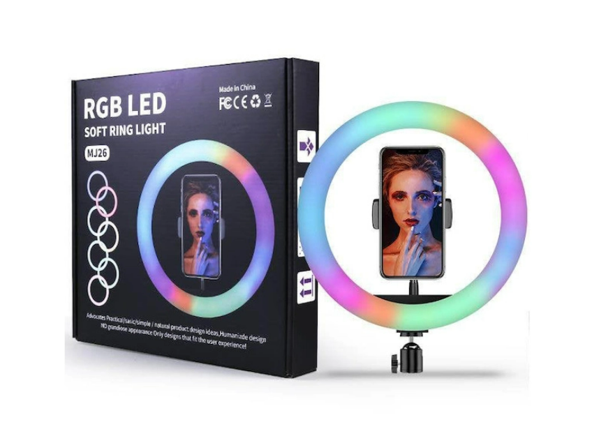 The RGB LED MJ26 ring lamp on a tripod is designed to adjust the correct light during photo shoots (for face photos - makeup, hairstyle, etc.) The ring lamp with a phone holder is perfect for selfies. It is used for photography, video streaming, and live streaming. Suitable for mobile phones up to 6.5 inches. 360 degree rotation to adjust the angle.